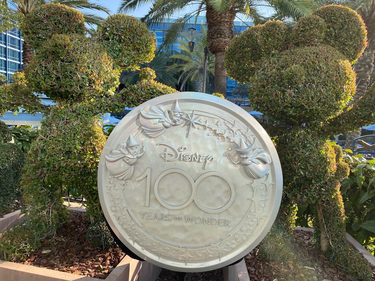 - Meanwhile, over near the E-Ticket Pool, a Disney100 shimmering silver medallion has been placed between the Mickey and Minnie topiaries.