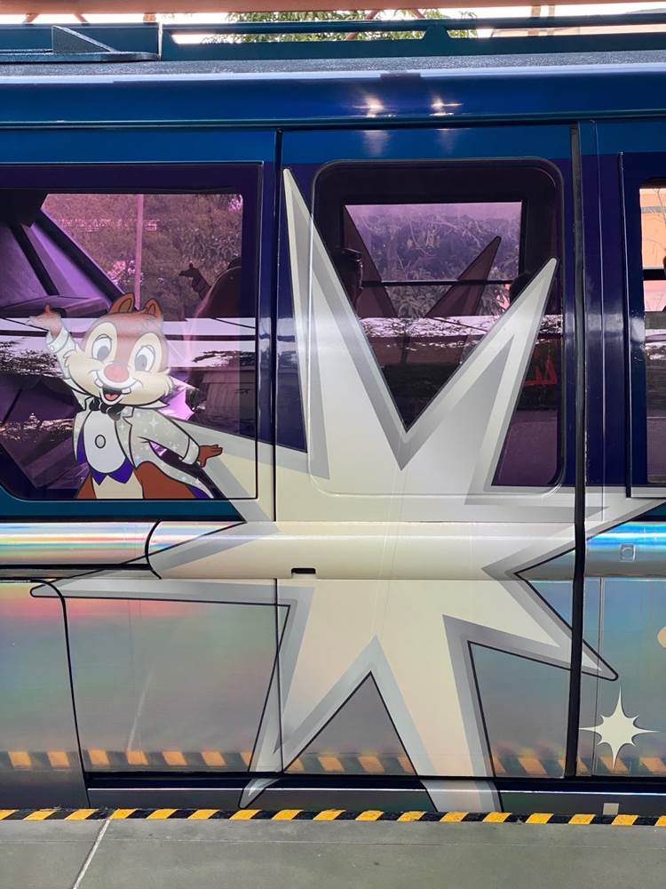 - We got a closer look at the new Disney100 Monorail wrap on Monorail Blue, featuring the Disney100 logo and Chip ‘n Dale at the front of the train, with the Sensational Six at the back, all in their Platinum outfits.