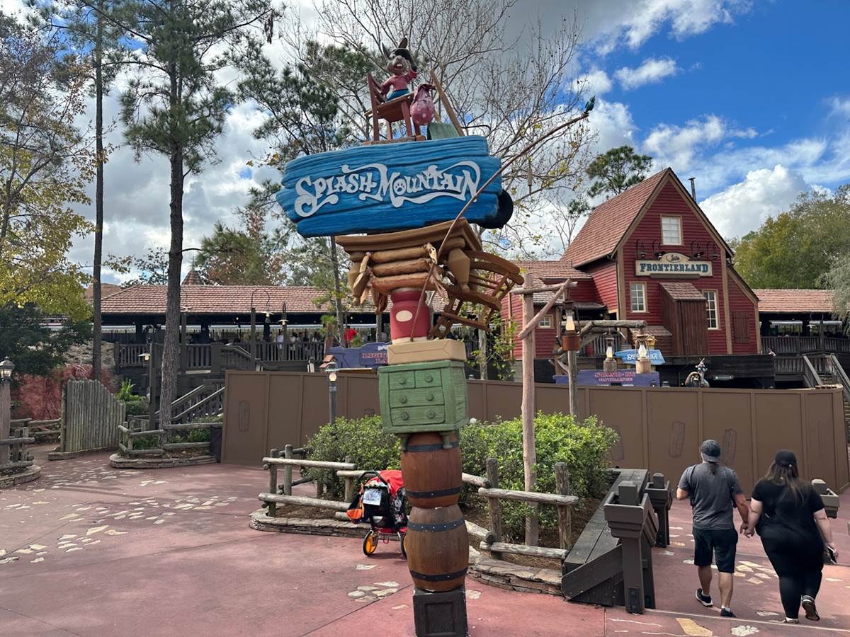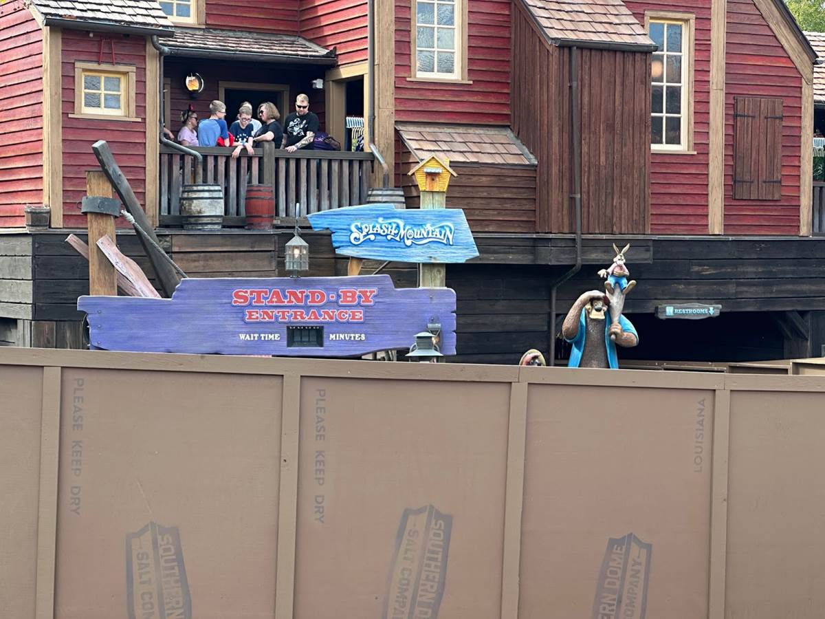 Of course, the water has been completely drained from the attraction. Construction walls surround the entrance to the attraction, but most Splash Mountain thematic details still remain.