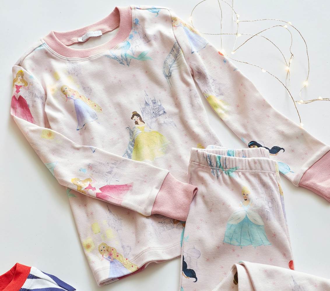 - Your little royal will love to bundle up for bed in these whimsical and bright PJs featuring their favorite Disney Princess characters like Belle, Cinderella, Jasmin and Aurora. Knitted from pure cotton, they’re supremely soft and keep them warm.