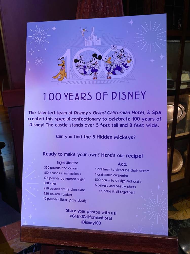 This new Disney100 display can be found in the lobby of the Grand Californian, near the Hearthstone Lounge. It features the Fab 5 in front of a 5 feet tall Sleeping Beauty Castle, all made out of delicious treats.