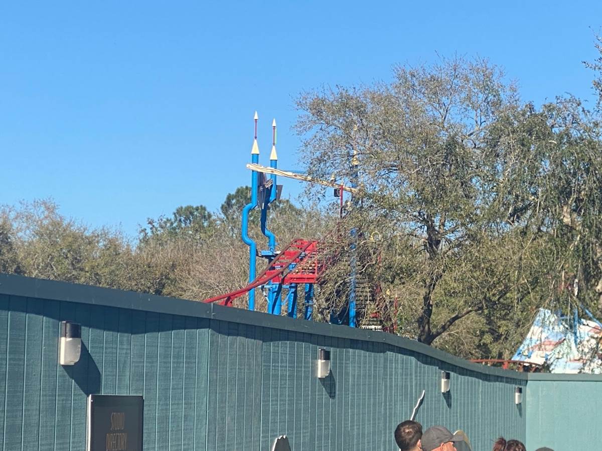 From the E.T. Adventure queue, we can see that a small amount of the main structure for Fievel’s Waterslide remains hidden amongst the trees.