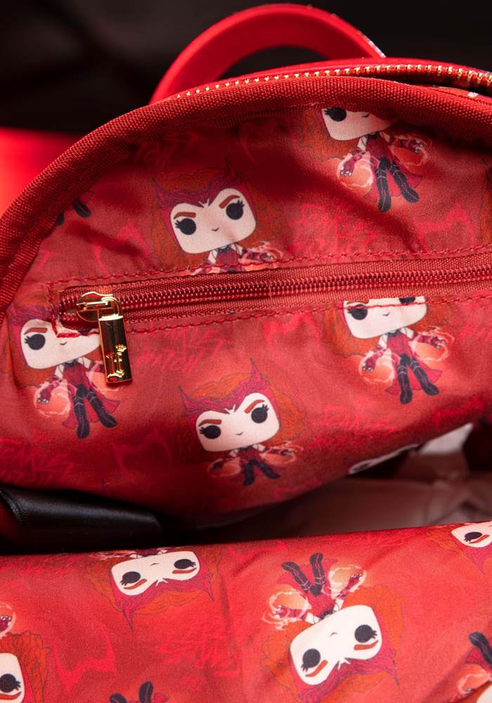 - As is common with Loungefly bags, the interior has a cool lining that’s decorated with Pop! Scarlet Witch images. The back of the bag reads “The Scarlet Witch" written above an icon of her headdress.
