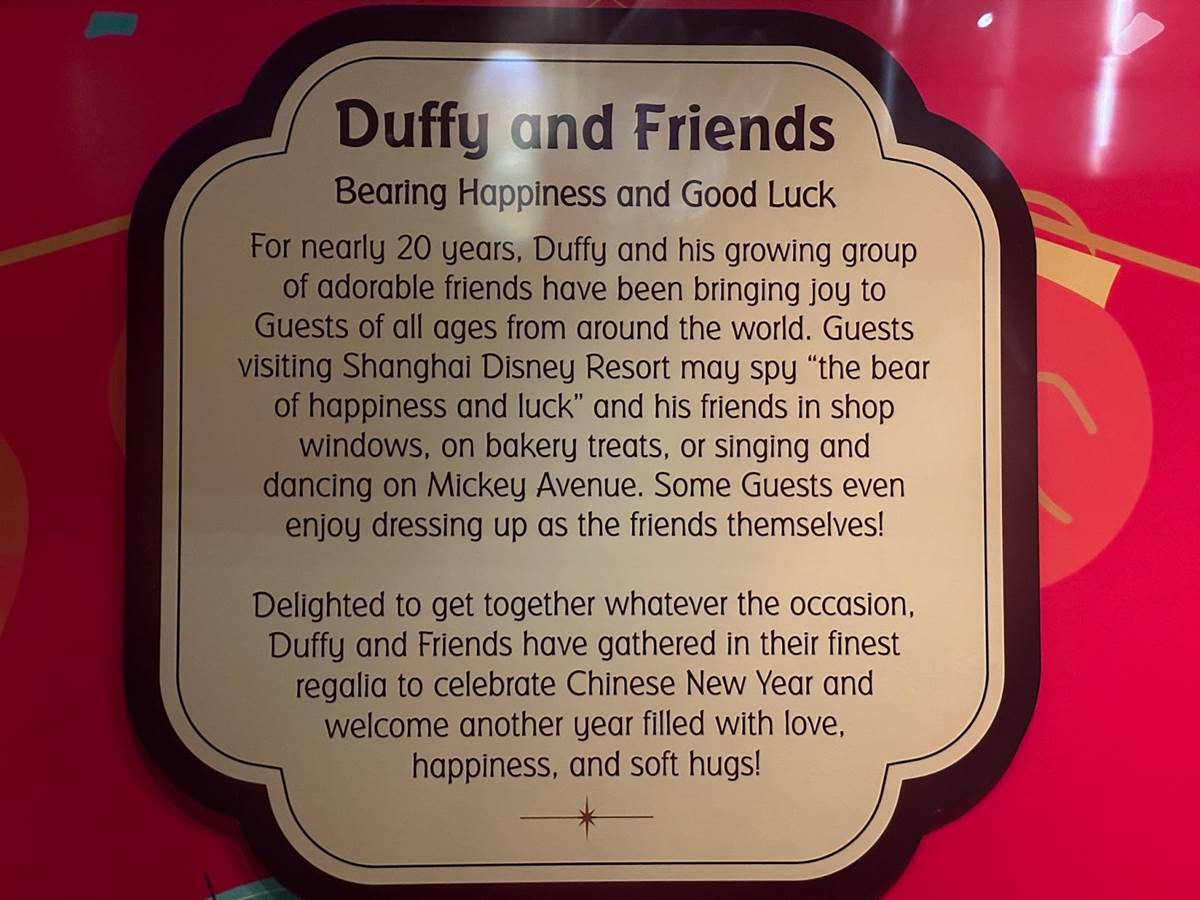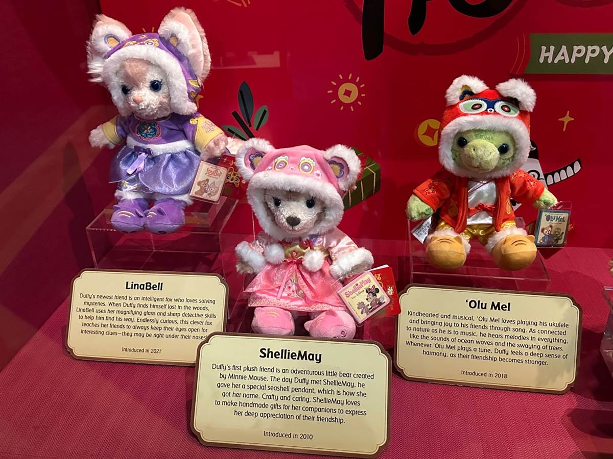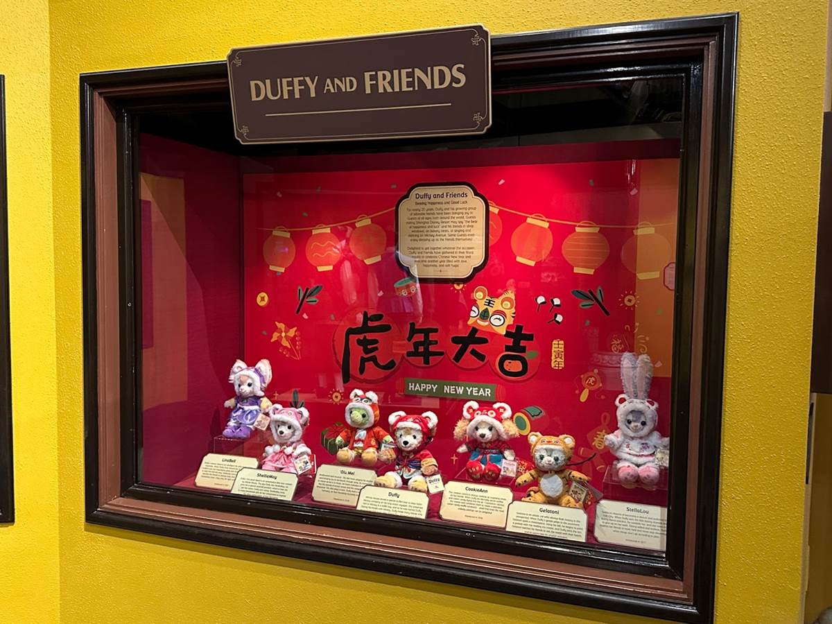 This display was installed in December 2022 inside the House of the Whispering Willows Gallery, which has been home to the Inside Shanghai Disney Resort exhibit since 2016. Plush versions of all of Duffy’s friends in their Lunar New Year outfits can be seen, including LinaBell, ShellieMay, ‘Olu Mel, CookieAnn, Gelatoni, StellaLou, and of course, Duffy himself!