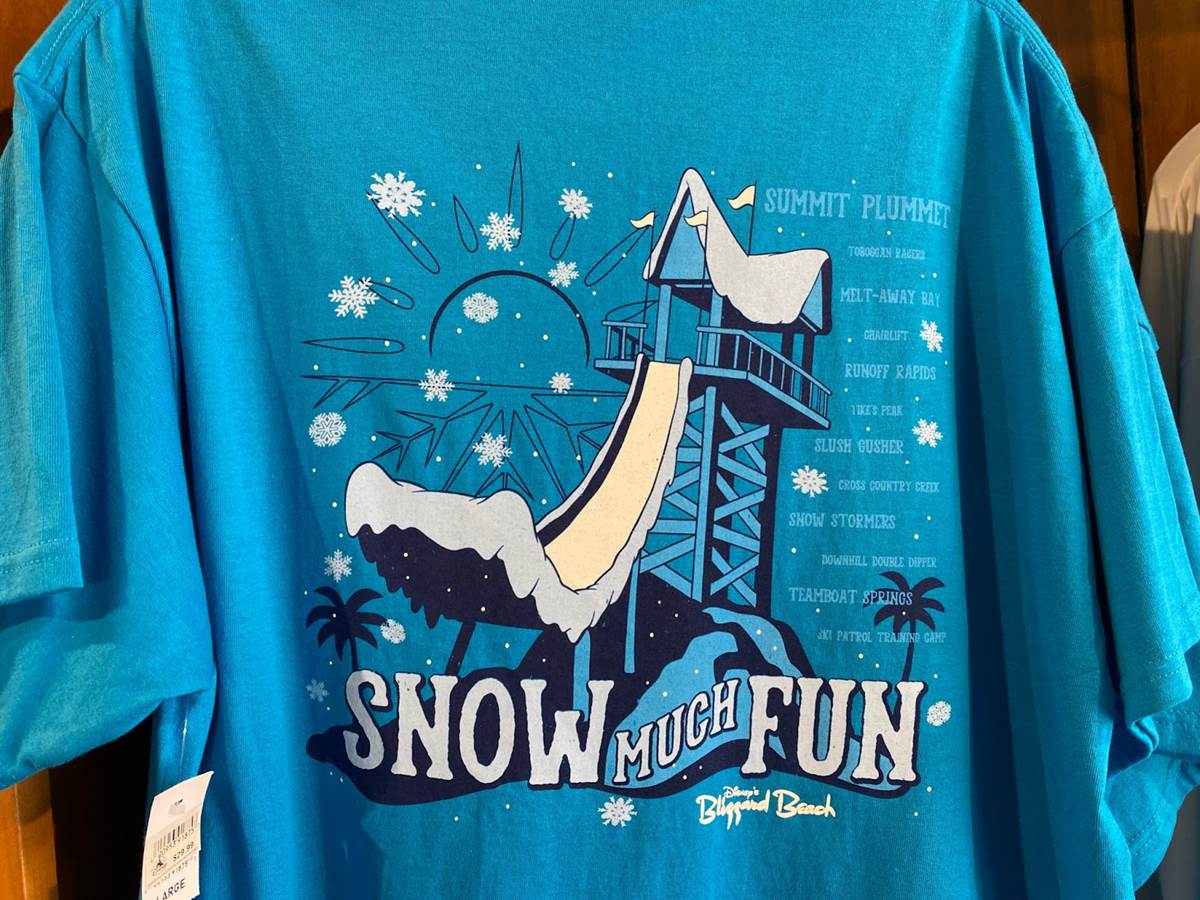 Additionally, there’s a new shirt featuring the Blizzard Beach logo on the front, and Summit Plummet on the back, alongside the names of the park’s various attractions. The shirt retails for $29.99.