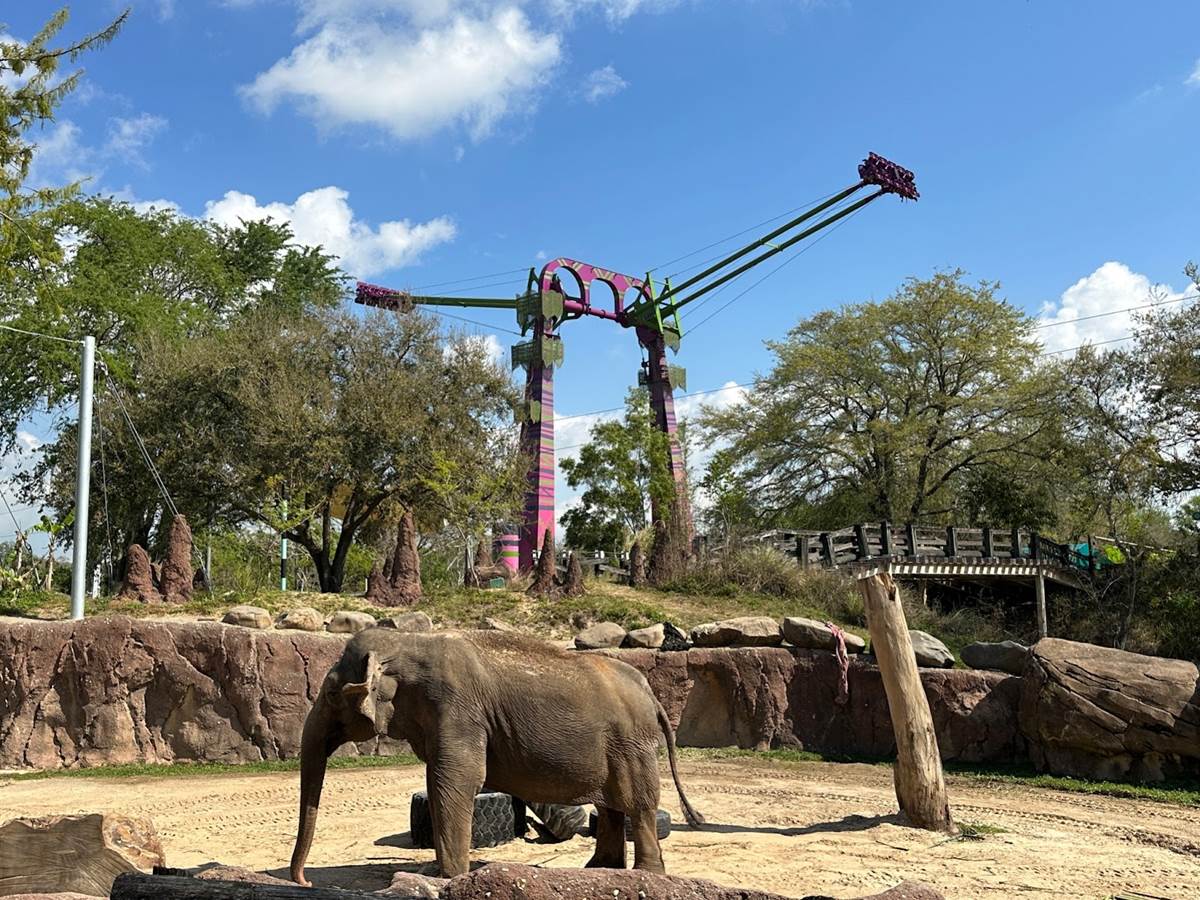 Further back from the attraction, you can get some impressive shots of the attraction in the distance with the park’s elephants in the foreground.