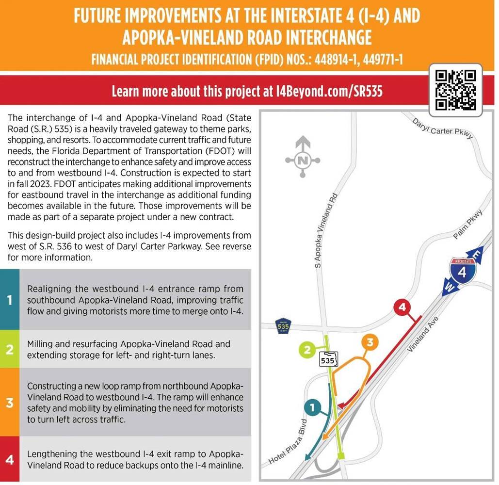 - The interchange of Interstate 4 (I‑4) and Apopka-Vineland Road (State Road (S.R.) 535) is a heavily traveled gateway to theme parks, shopping, and resorts. This project will partially reconstruct the interchange to enhance safety and improve access to and from westbound I‑4. Planned improvements include:
