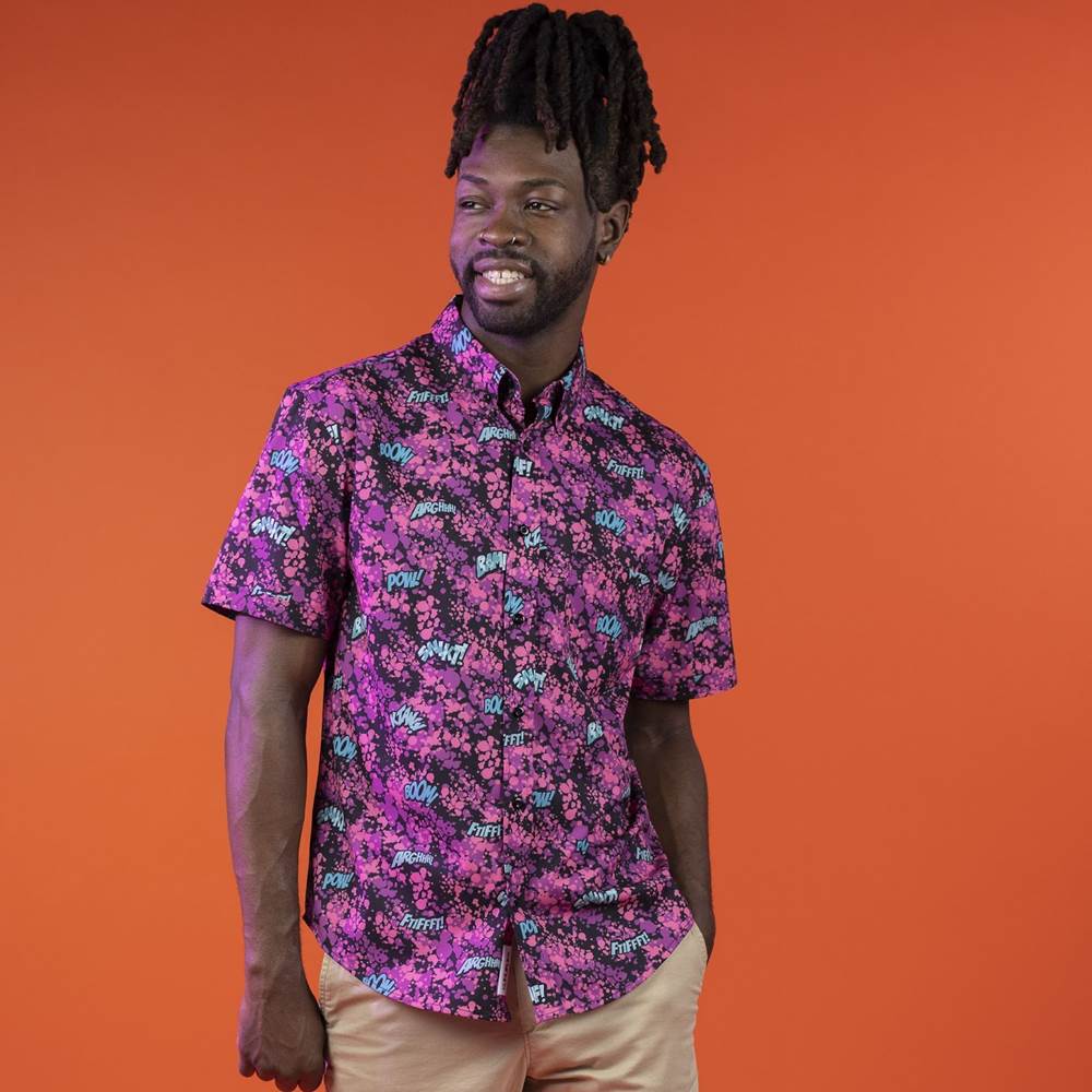 “You know you’re a comic book legend when you have a signature sound. The iconic design of this effervescent KUNUFLEX button down contains a collage of trademark SFX from your favorite Marvel Super Heroes. A closer look at a few choice words might just reveal some familiar faces, bub."