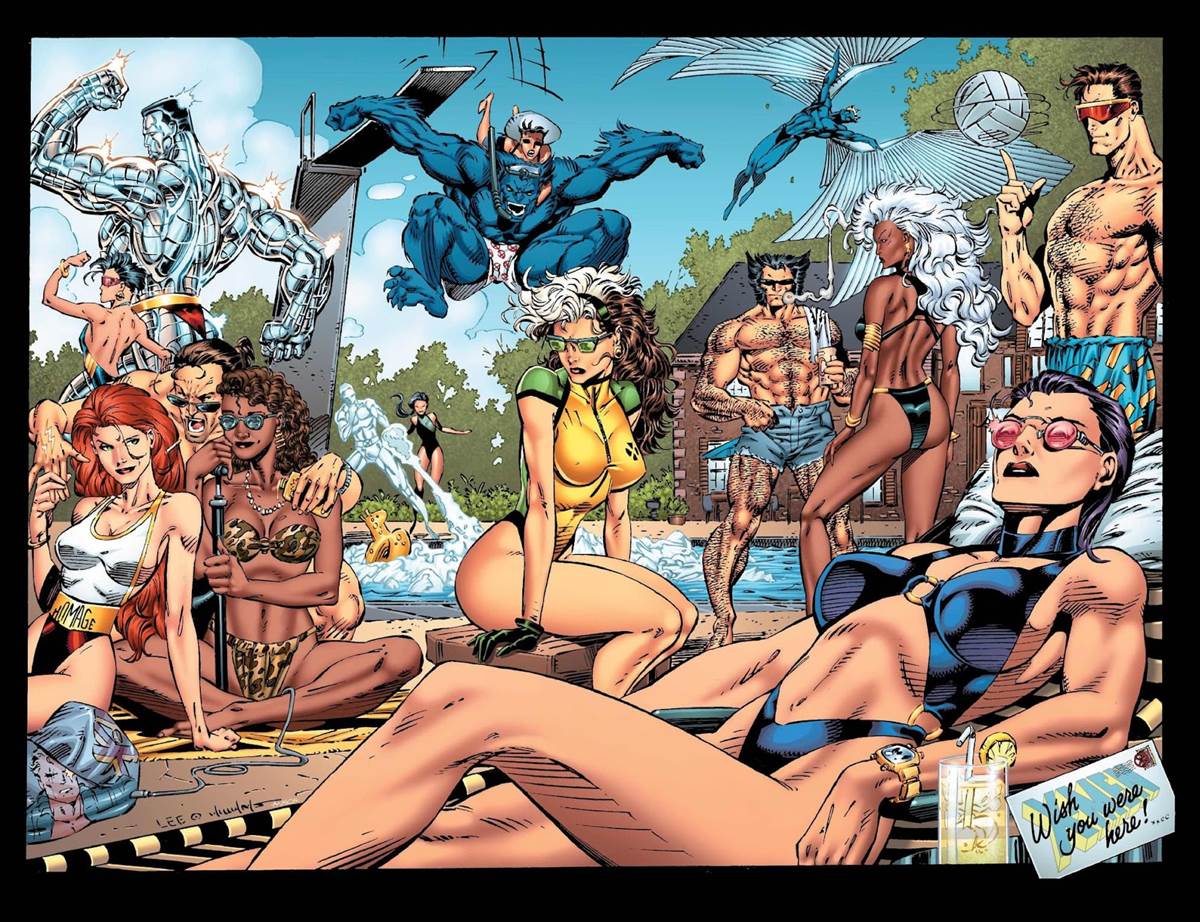 - In “X-Men (1991) #1," Chris Claremont and Jim Lee featured several pinup images that highlighted various aspects of the X-Men’s world, including one double-page spread where the X-Men take a much-needed break by the X-Mansion’s pool.