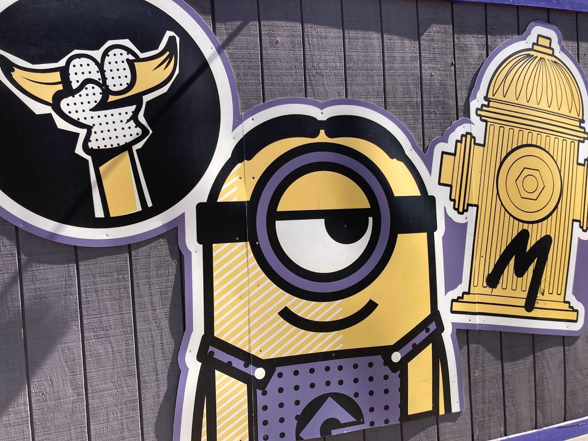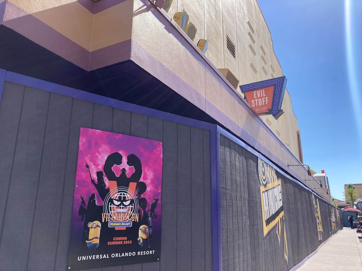 - Minion-themed construction walls still surround the building as we await the opening of the attraction this summer.