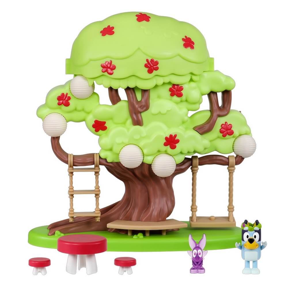 The irresistible rope ladder invites Bluey and her friends to climb up the treehouse then slide back down from the other side. At the base of the tree is a seating area, a swing that fits Bluey and other character figures, as well as a hammock to relax. Look carefully and find a secret door that opens the top of the tree to reveal a secret fairy hideaway.