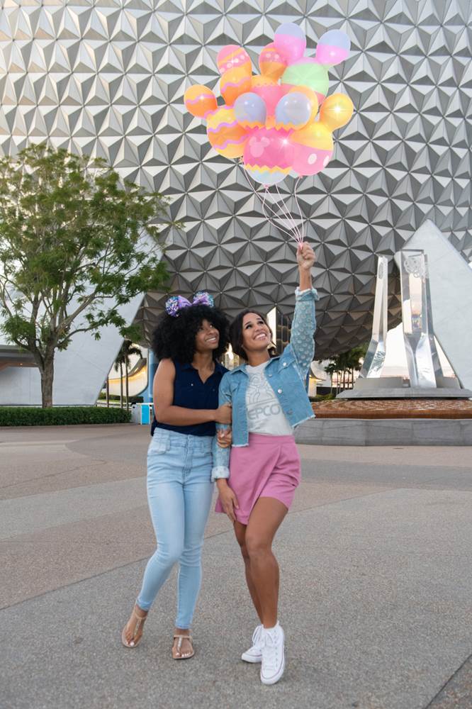 - Guests pose as if they’re holding a collection of Easter balloons, as showcased by this duo in front of Spaceship Earth at EPCOT.