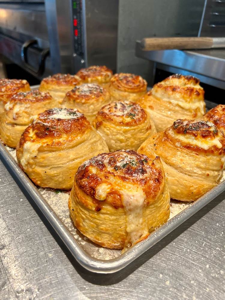 - The new item features a housemade garlic-cheese pinwheel, layered with mozzarella, provolone, roasted garlic, and parmigiano, and served with marinara.