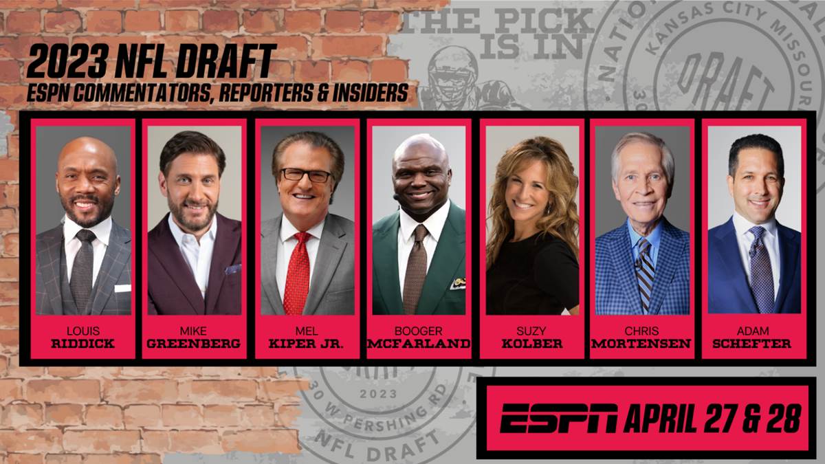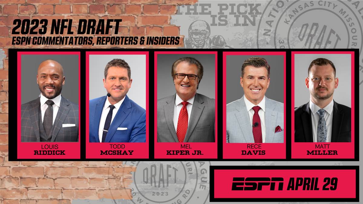 - ESPN’s NFL Draft commentator roster is full of familiar faces, including Mel Kiper Jr., who will be working his 40th NFL Draft for ESPN. Booger McFarland, a 1999 NFL draftee, and Louis Riddick, a 1991 NFL draftee, will join Kiper on the desk for Thursday and Friday night, their fifth and ninth years, respectively, as part of ESPN’s NFL Draft telecast. Mike Greenberg, an ESPN mainstay for more than 26 years, will host the NFL Draft on ESPN for the third consecutive year.