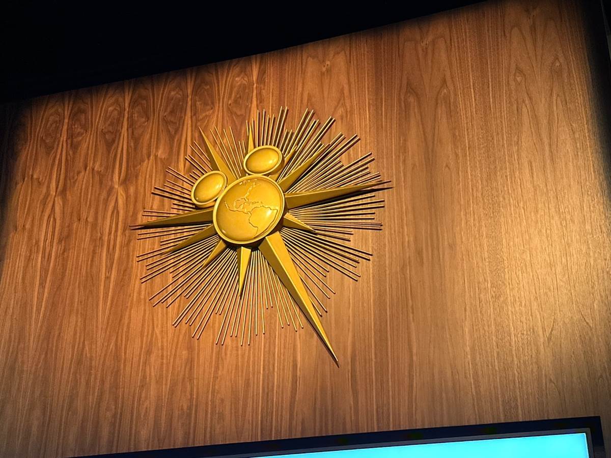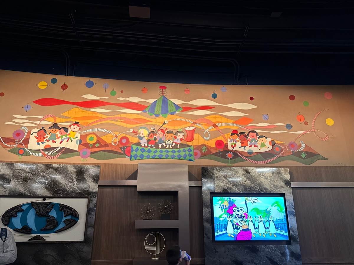 And now we arrive at the lounge itself, featuring a variety of murals designed by Disney Legends such as Mary Blair, John Hench and Herbert Ryman. Some historic Disney gems can also be found within, such as the K7 Space Suit worn by the Tomorrowland Astronauts during the early years of Disneyland, and the Space Station S-1 Model from the Disneyland television series.