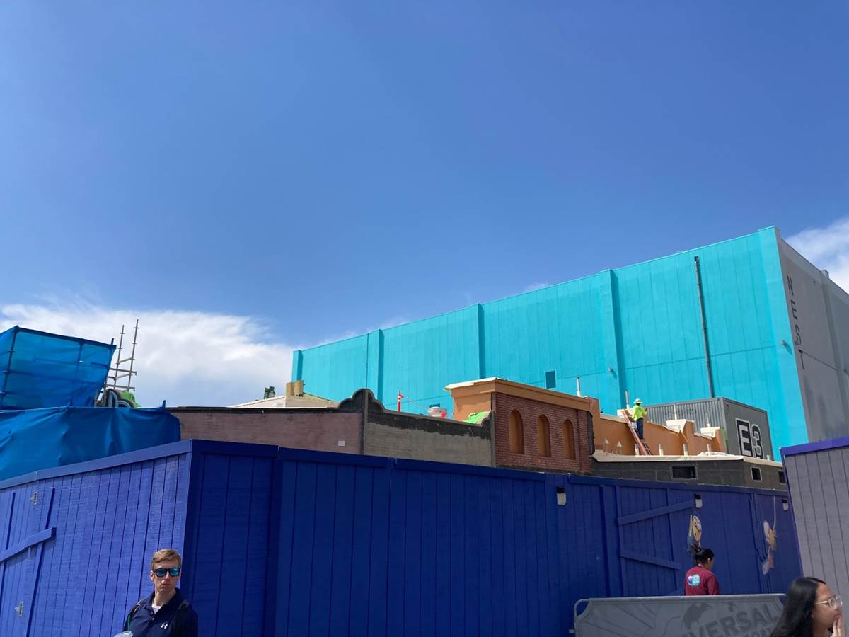 And right nearby this new booth, work continues on Illumination’s Villain-Con Minion Blast and the Minion Cafe. More character posters have been added to the new attraction while the cafe is starting to receive a brick facade.