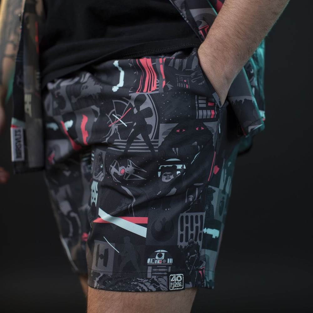 Every story has to come to an end. RSVLTS honors the beloved Original Trilogy with a muted shirt that zeroes in on key players of the franchise as well as iconic moments (and weapons) vital to the fate of the galaxy. Available in classic, women’s, preschool, hybrid shorts and koozies.