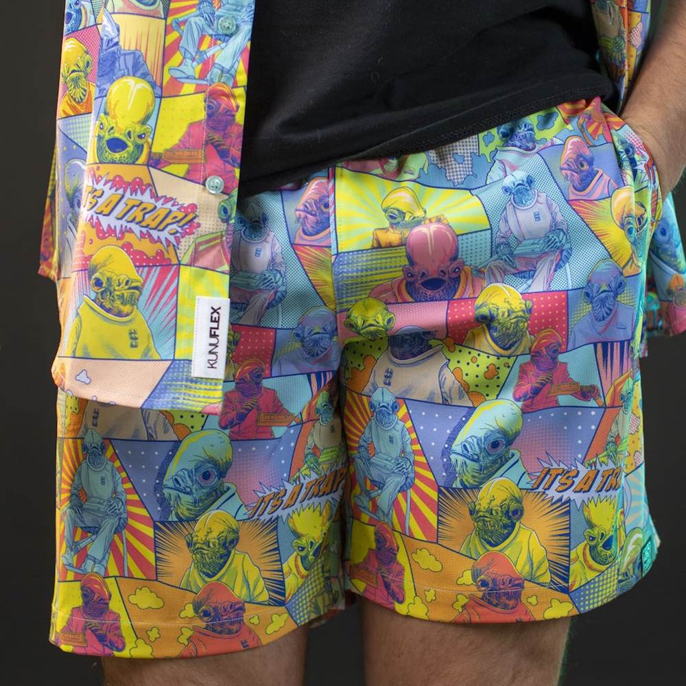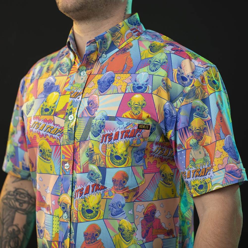 You need more Admiral Ackbar in your life and RSVLTS is here to deliver! The Rebel leader is featured in a neon color palette and boy does he look good. Each image feels like it’s lifted right off the screen, or like a series of photos to be selected for his memoir. For added fun, his iconic phrase “It’s a trap!" is sprinkled throughout so you never forget he’s the one who figured it out. Available in classic, women’s, preschool, hybrid shorts and koozies