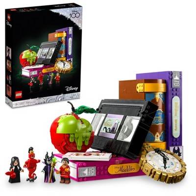 - This detailed Disney villain collectible set features 2 brick-built VHS cases referencing Disney’s Aladdin and Sleeping Beauty, a VHS ‘tape’ of The Little Mermaid, a book representing Beauty and the Beast, a Queen of Hearts playing card for Alice in Wonderland, a ‘poison’ apple for Snow White and a pocket watch representing Captain Hook from Peter Pan.