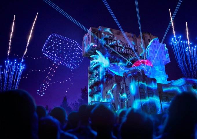 - Throughout the performance (weather permitting) drones illuminate in the night sky in the shape of familiar Marvel icons, including Thor’s hammer and Captain America’s Shield.