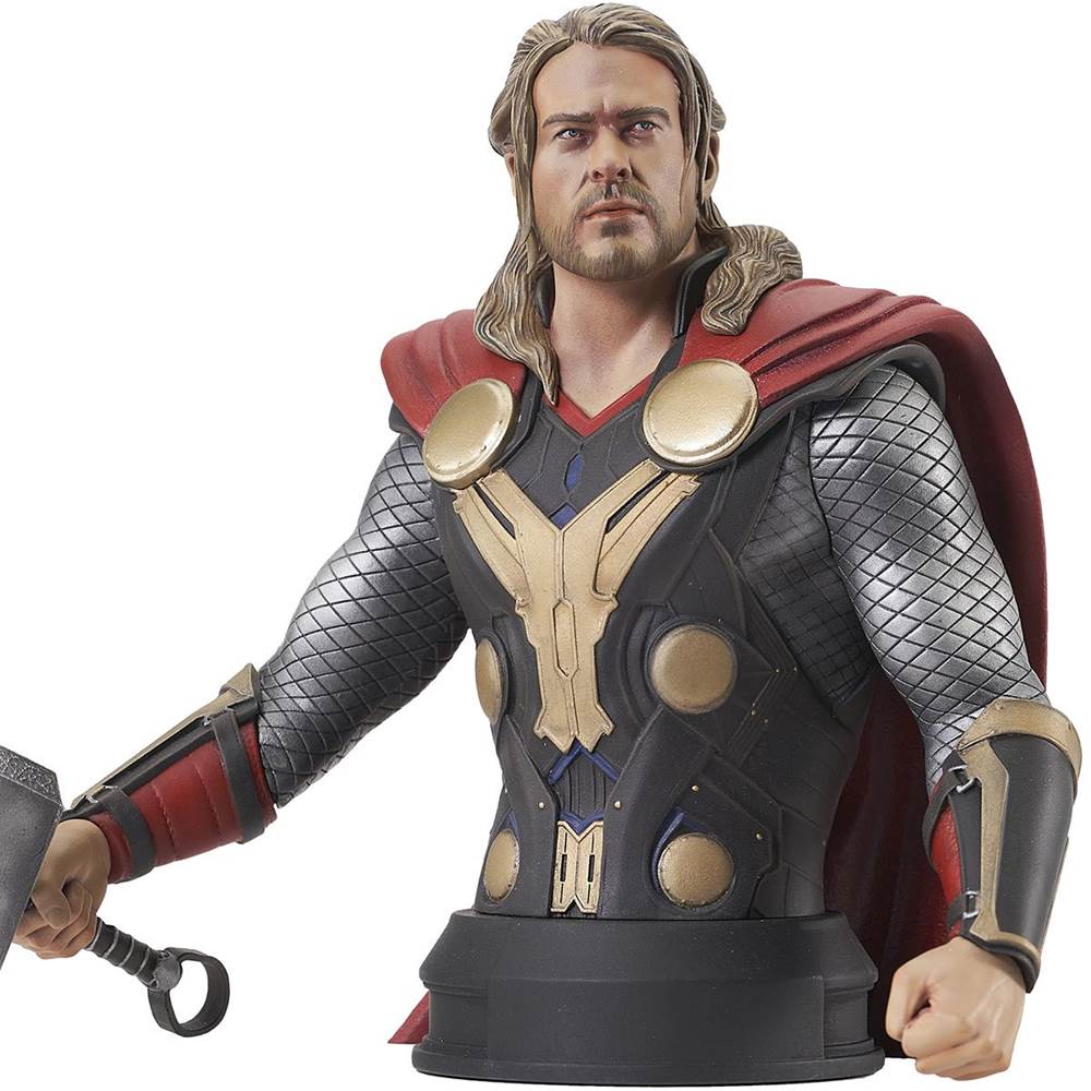 “Return to the Dark World! Inspired by his appearance in the second Thor movie, this mini-bust depicts Thor in his traditional garb and the mythical hammer Mjolnir."