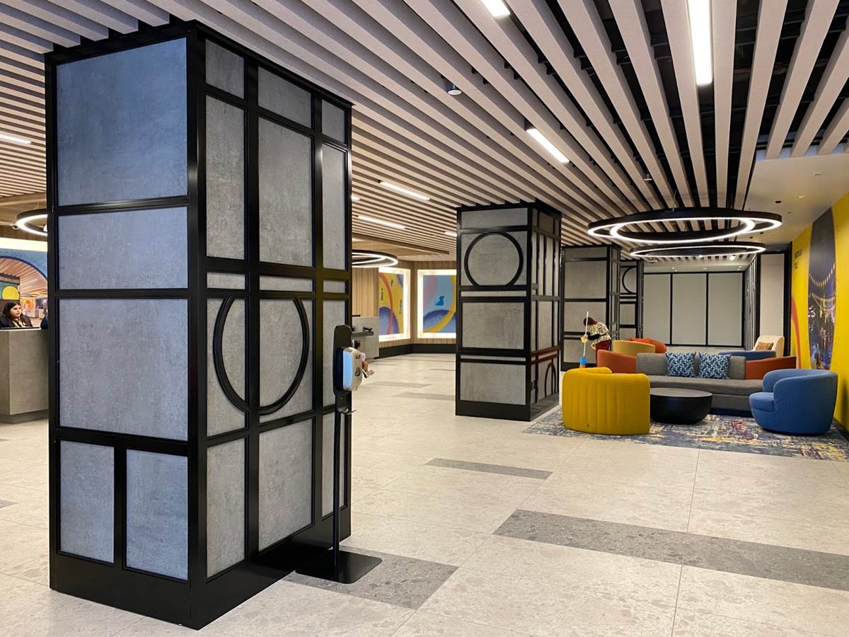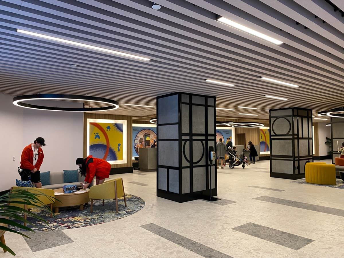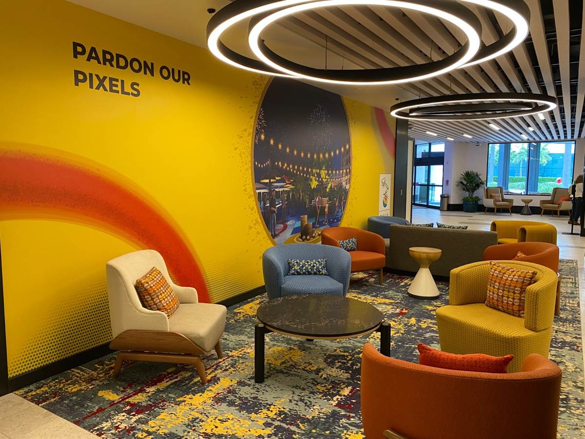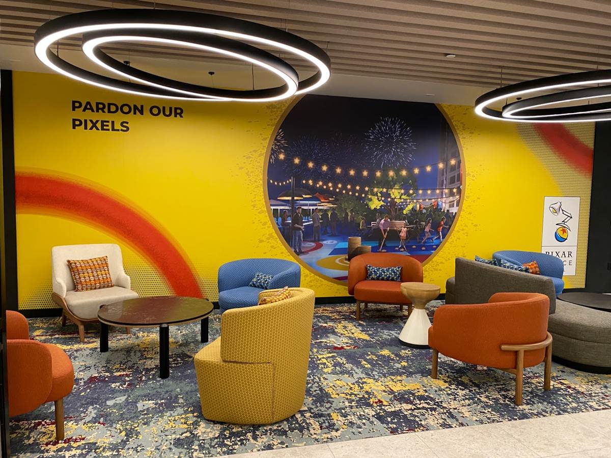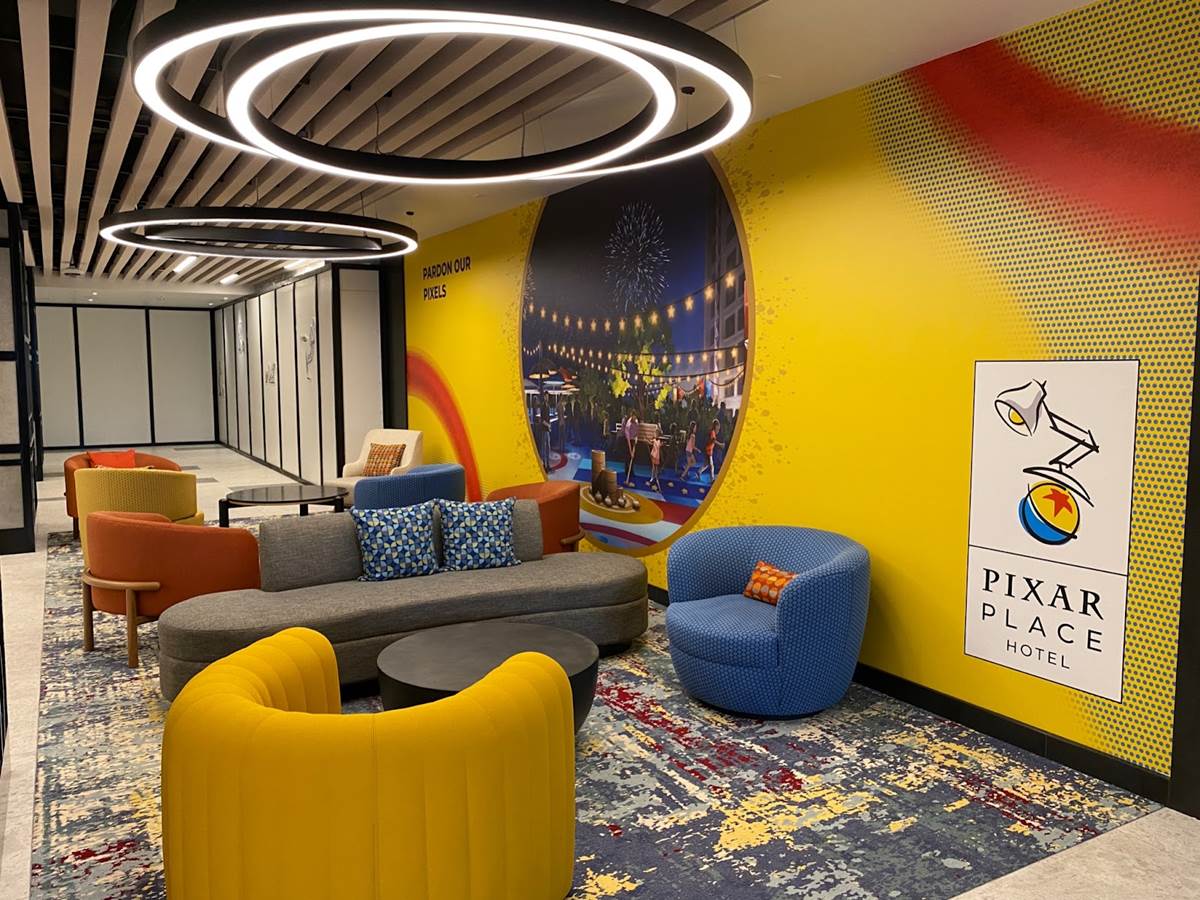 New furniture with Pixar-inspired coloring has been added throughout the lobby.