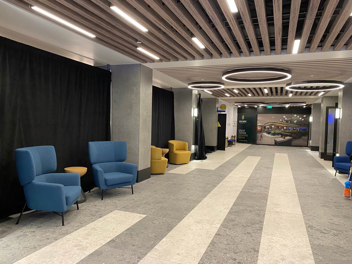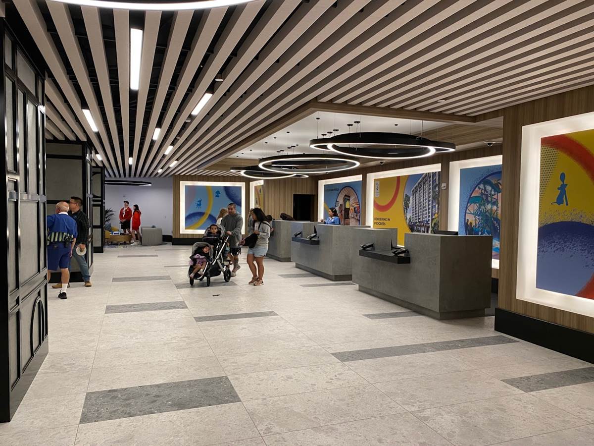 The check-in area has been expanded along with new, more open desks. New art, as well as concept art showcasing the future of the hotel decorates the area.