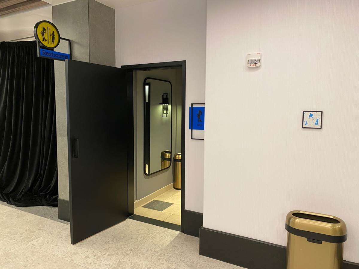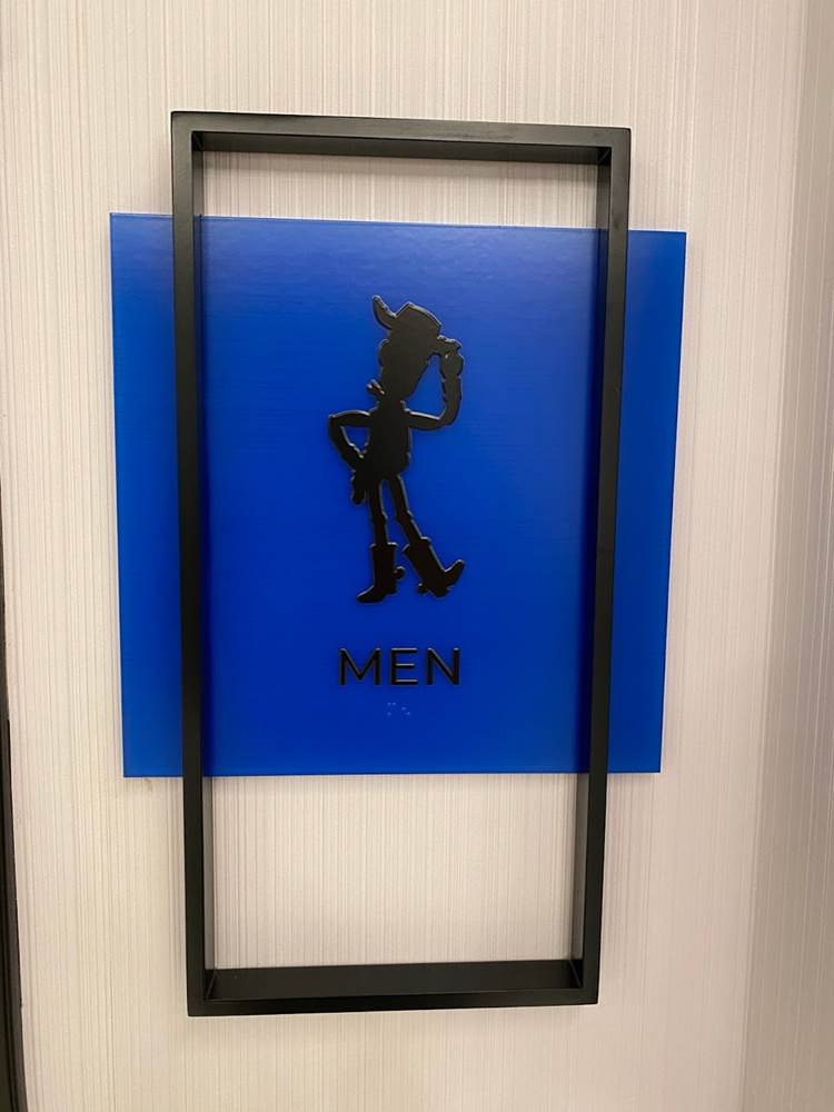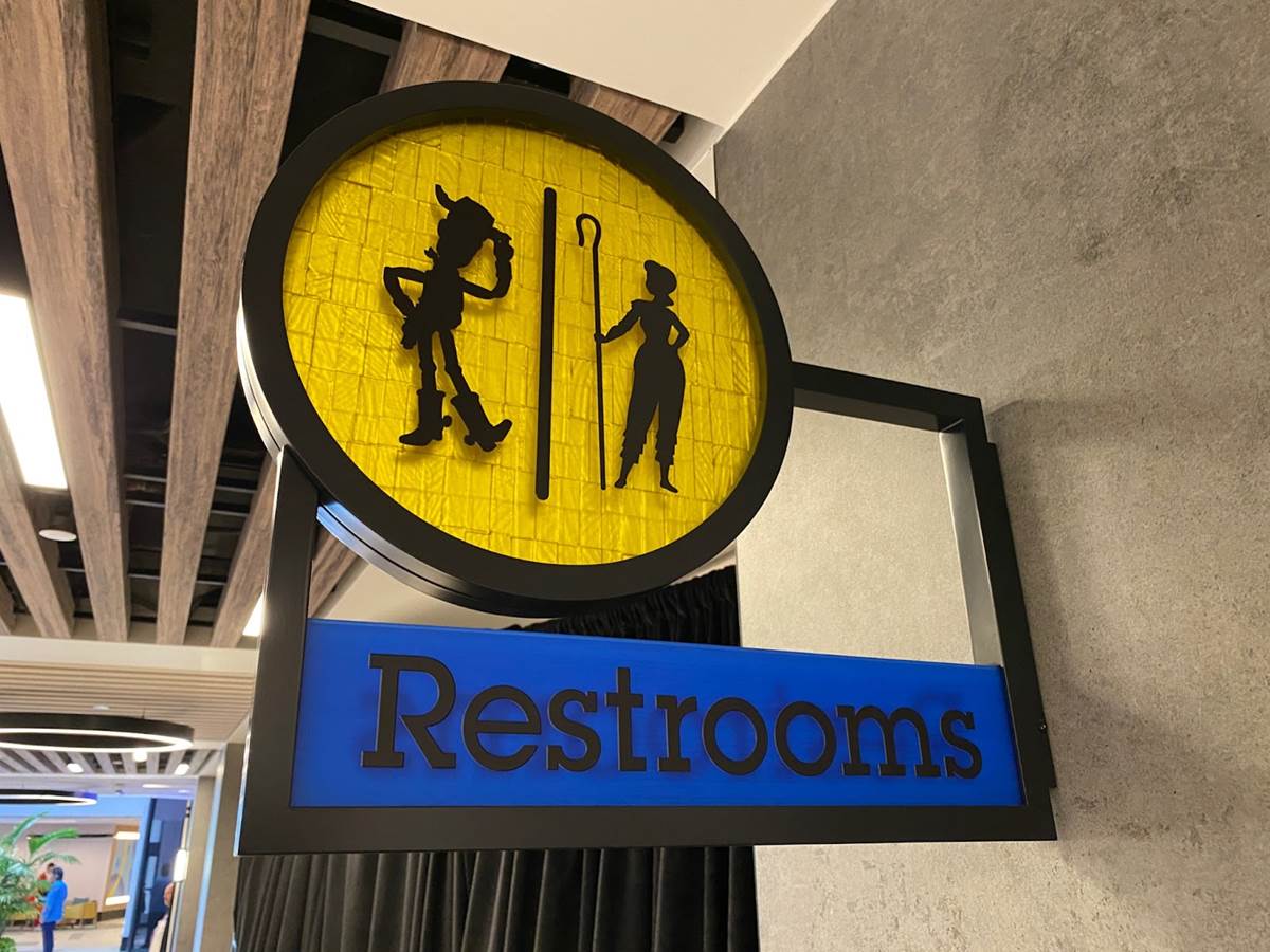 The restrooms in near the future Great Maple Restaurant feature Woody and Bo Peep on the signage.