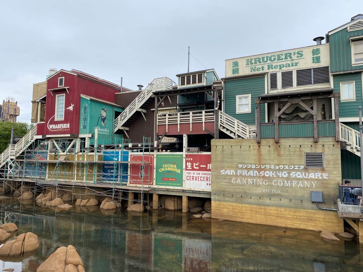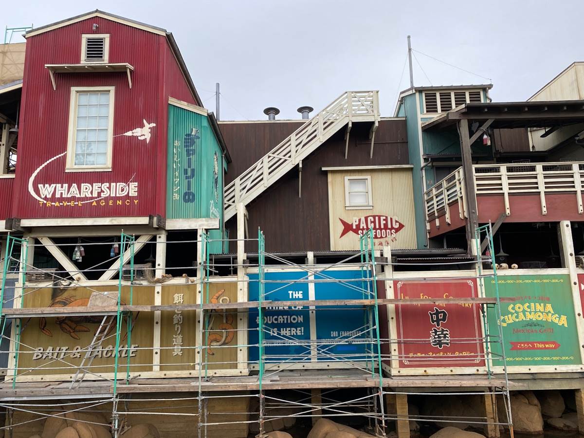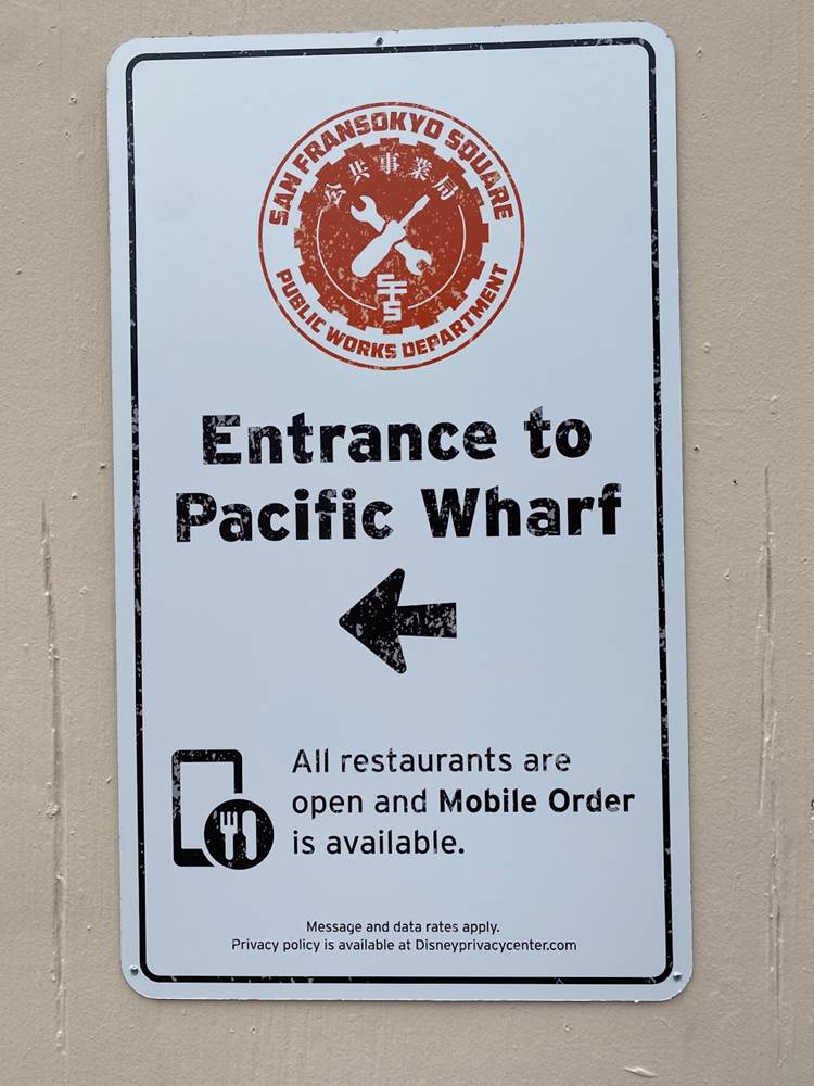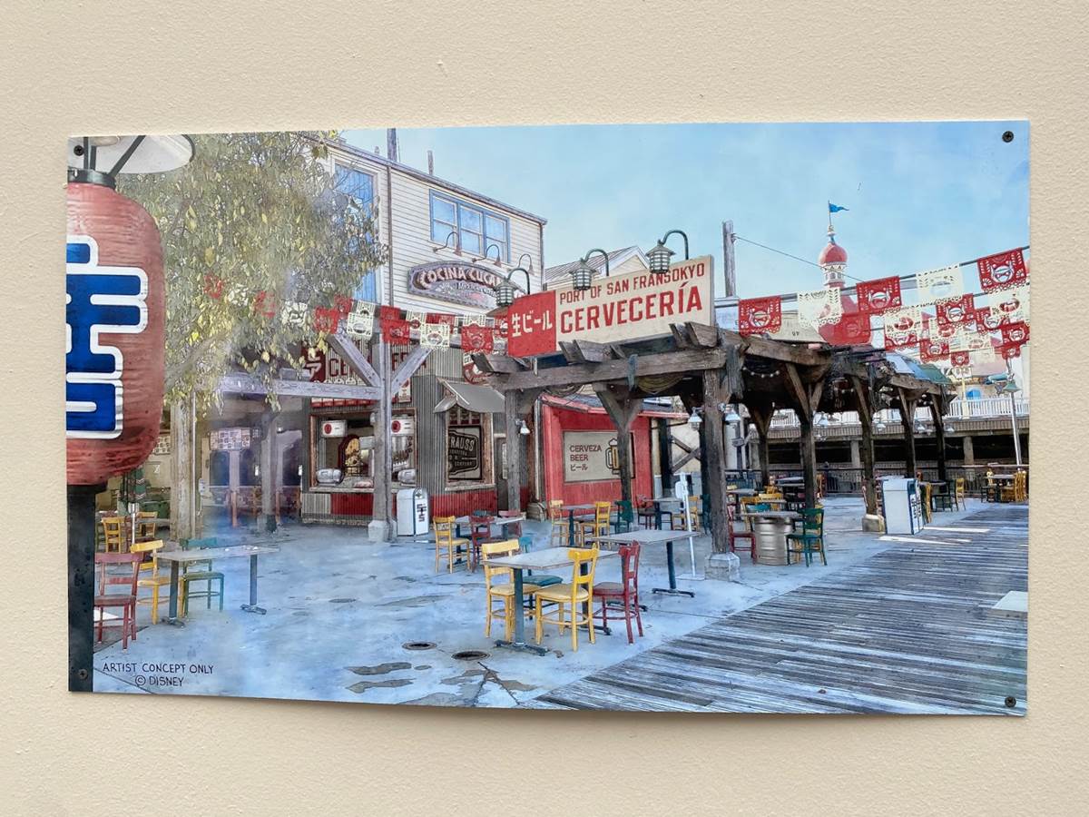 Plenty of new signage has been painted onto the buildings of the future San Fransokyo Square, inspired by the city featured in Big Hero 6. Most of the old Pacific Wharf establishments are sticking around, such as Cocina Cucamonga. Plenty of Big Hero 6 references have been worked in, such as the Baymax you can spot flying above the Wharfside Travel Agency sign.