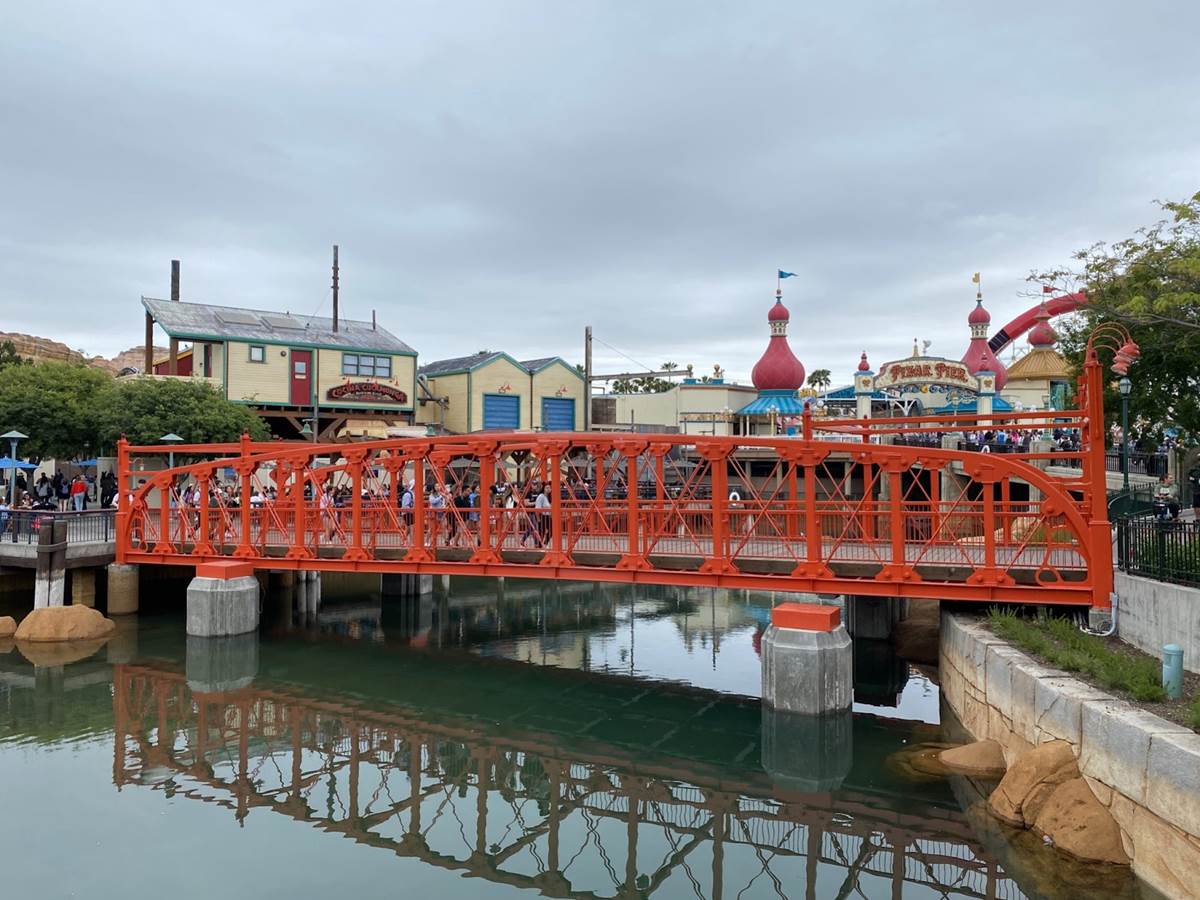 The bridge to Pacific Wharf has been painted red, but has yet to receive its full Golden Gate Bridge-esque makeover.