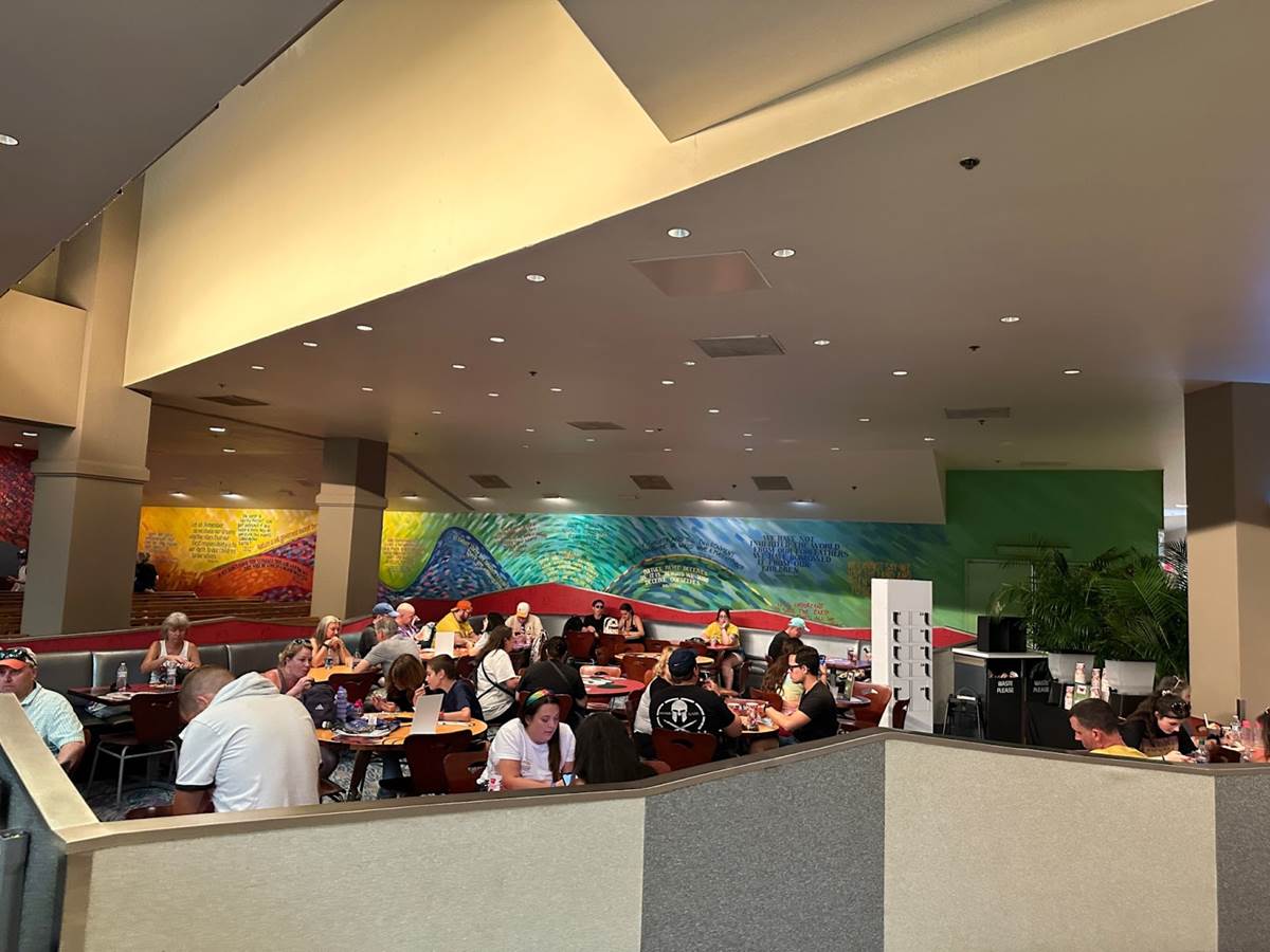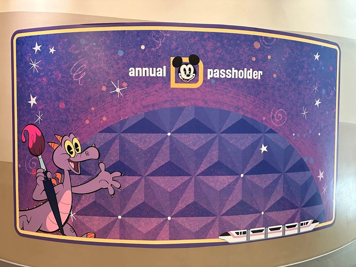 The new Annual Passholder lounge is located in the back seating section of Sunshine Seasons, closest to the Living with the Land queue. The entrance can be pointed out by this fun photo-op featuring Spaceship Earth and Figment, as he appears in the new AP magnet.