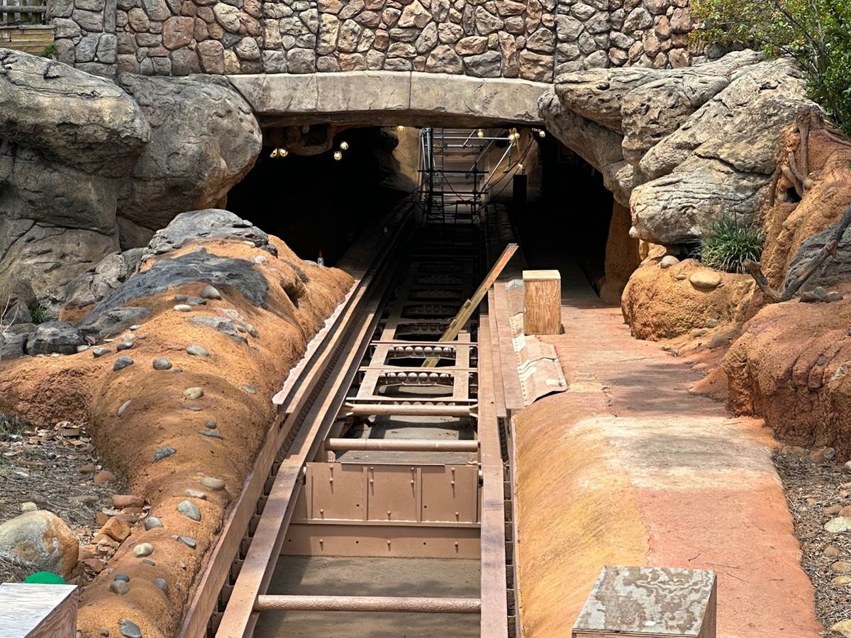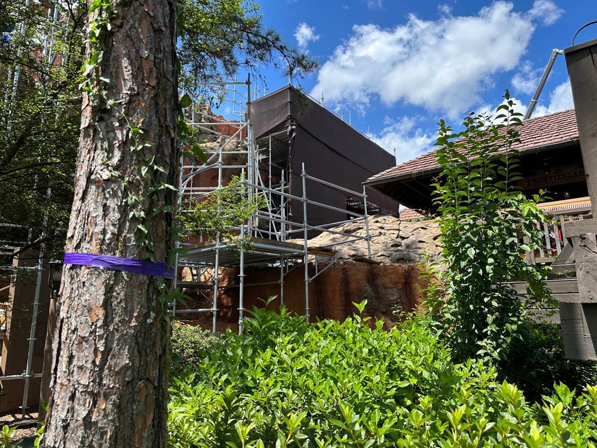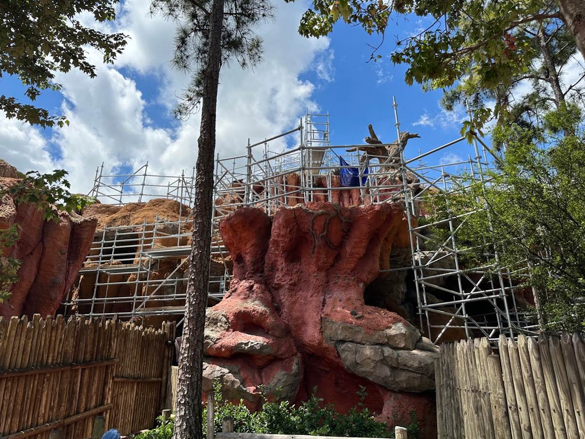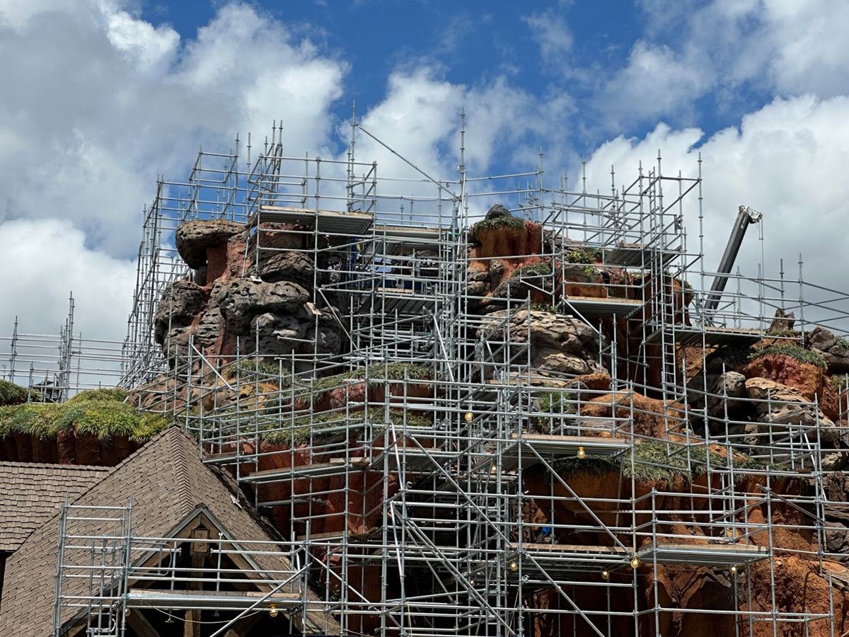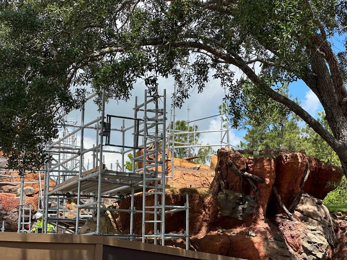 Recently, the top of the former Chickapin Hill was removed, as the new attraction will be a salt mine, as there are no mountains in New Orleans. Scaffolding stretches high up the structure as it is reshaped.