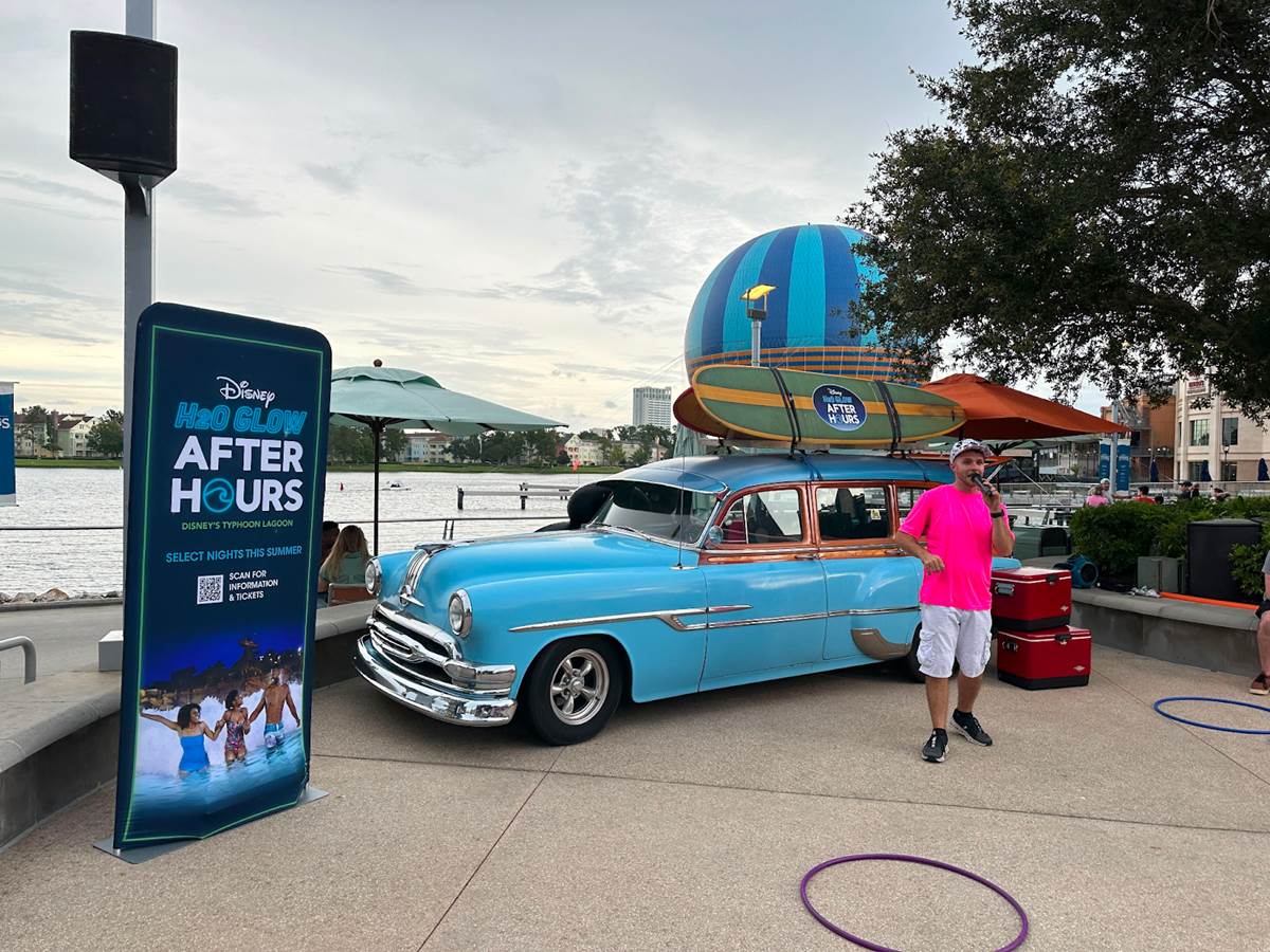 Disney is advertising the H2O Glow After Hours event at Typhoon Lagoon with a small dance party setup at Disney Springs.