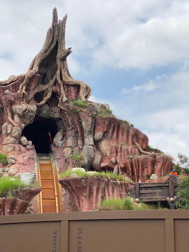 - Meanwhile, over at the attraction, more construction walls have been erected around the former Splash Mountain. The waterfall is not running and the drop is even blocked by orange stanchions, while workers can be spotted around the attraction.