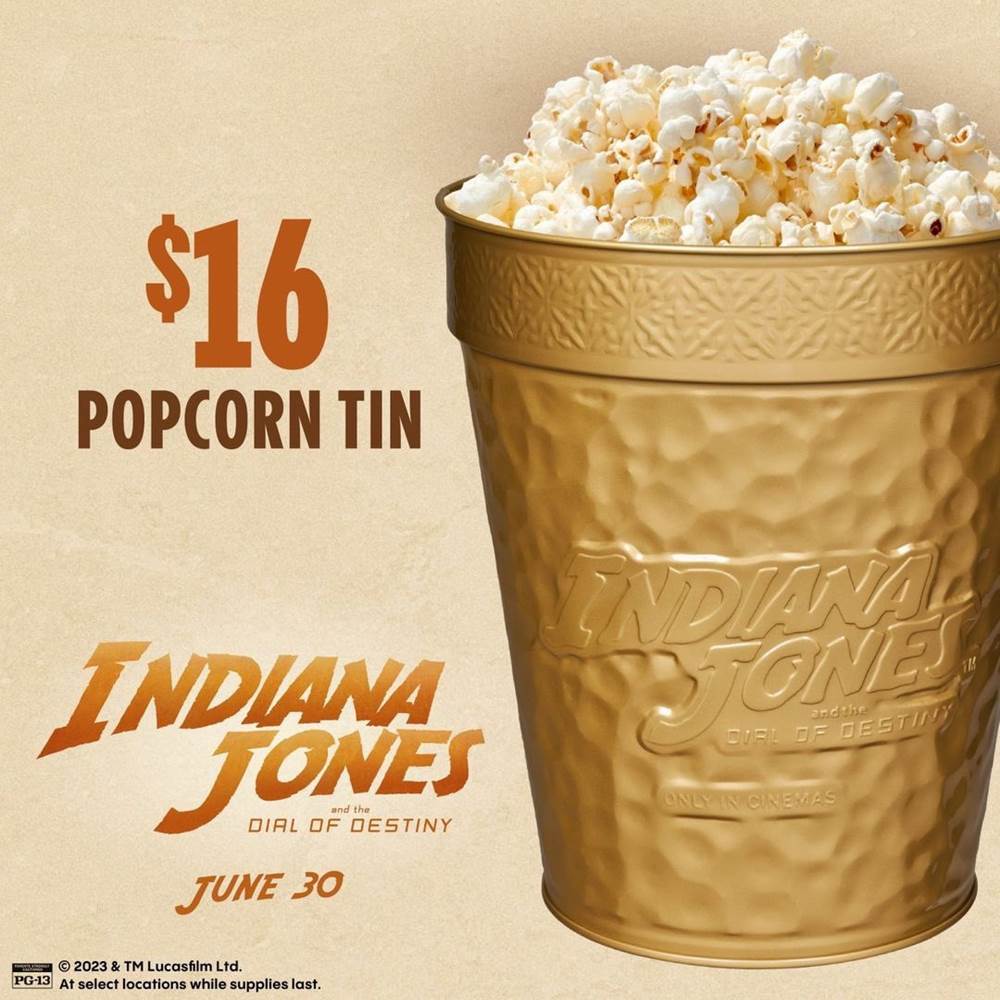 - While supplies last, you can purchase an Indiana Jones popcorn tin for $16 or a souvenir cup for $15.