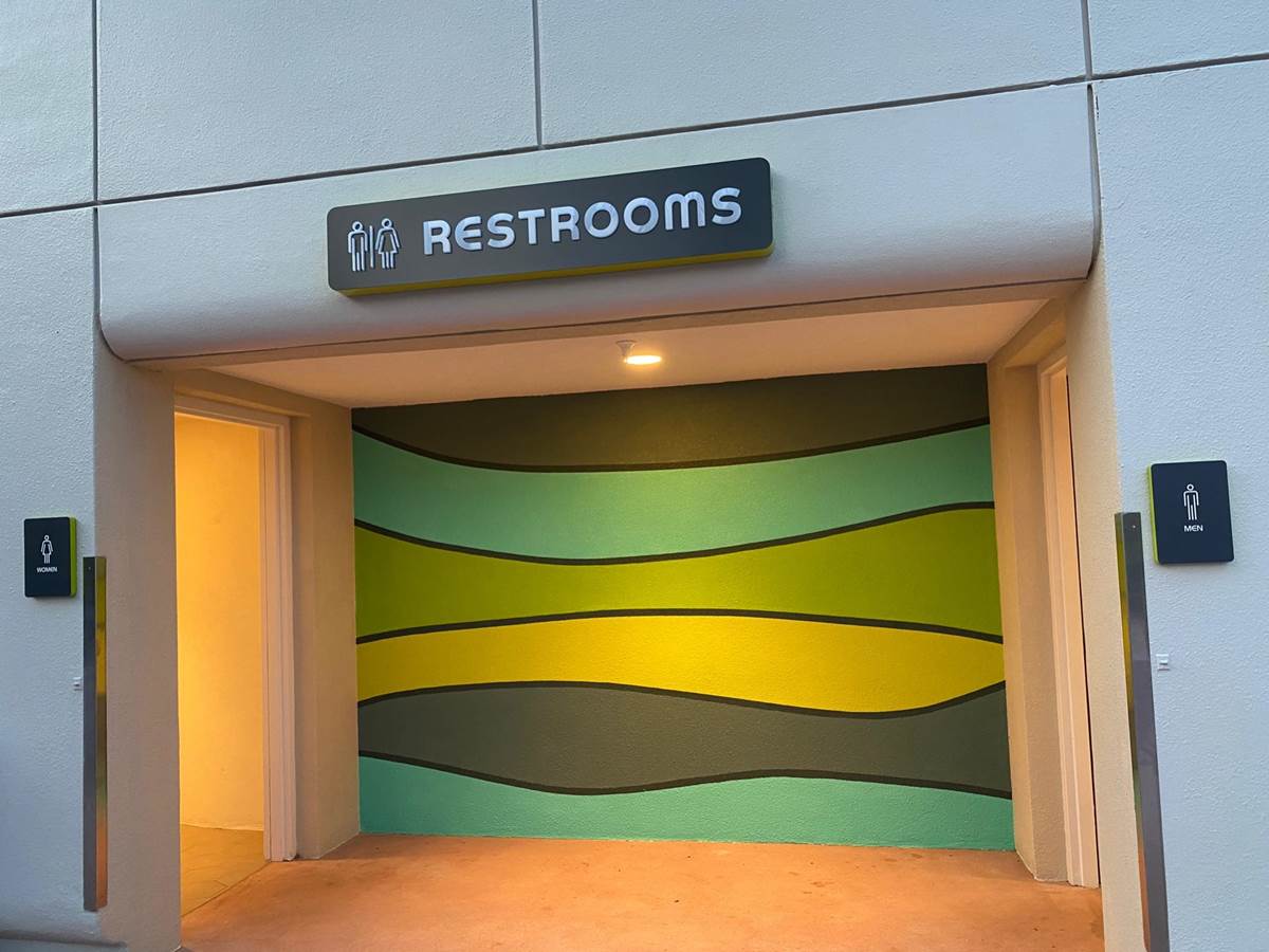 The styling of the restroom matches the new park-wide identity, including the modern EPCOT font. Inside, the restroom is essentially the same as the one over in World Discovery, but with green colors to match the World Nature location.