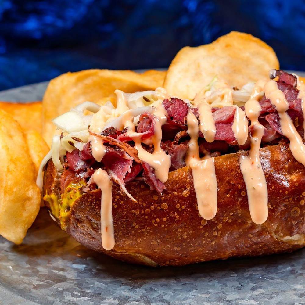 - Pastrami Pretzel Dog at Award Wieners: All-beef hot dog topped with pastrami, whole-grain mustard, provolone, sauerkraut, and thousand island dressing