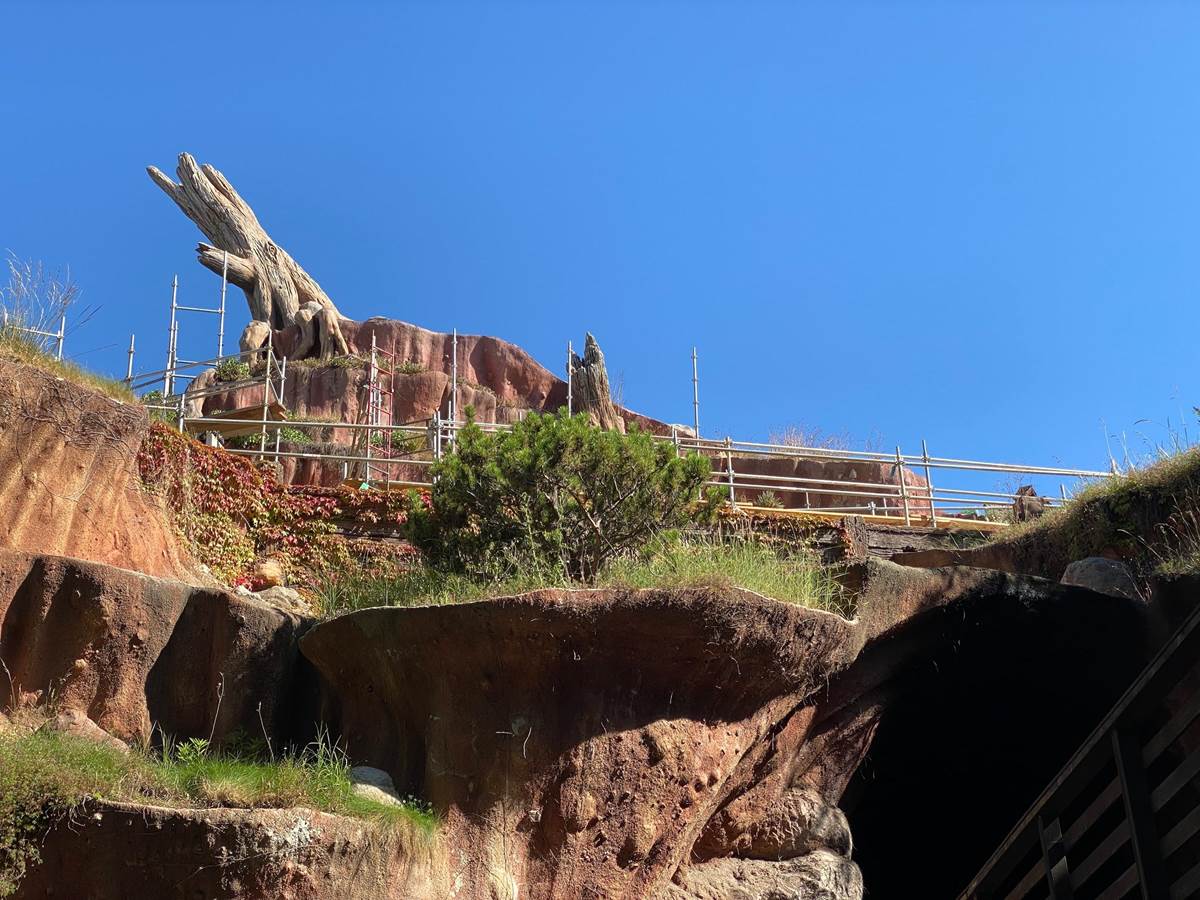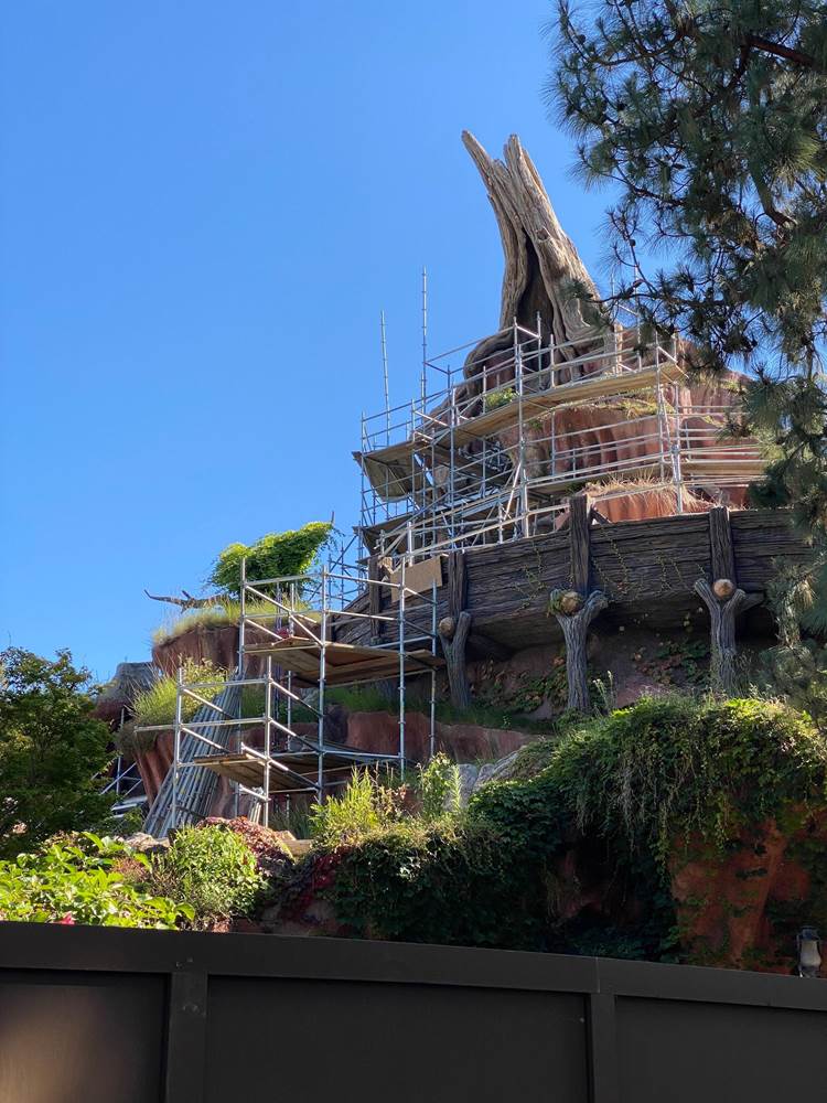 Scaffolding has appeared on the side of the mountain, allowing those working on the project to access the top of the attraction. It appears everything is moving on a similar path like that at Walt Disney World, where one of the first noticeable changes to the attraction’s features will be the removal of the iconic tree trunk at the top of Splash Mountain’s Chickapin Hill as it becomes Tiana’s Bayou Adventure. Based on the attraction’s model that was on display at D23 Expo late last year, this will become more of a dome and look quite different from the attraction we’ve known for over three decades.