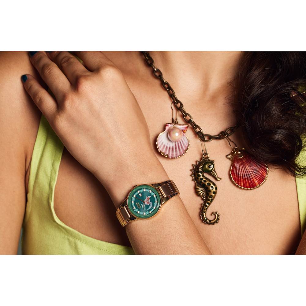 - The Ursula watch dial features her silhouette and a conch shell with crystal “sound bubbles" floating upwards, while the Ariel watch was inspired by underwater shades of green with a dial that shows an illustration of the mermaid diving. Both come with collectible companion pins.