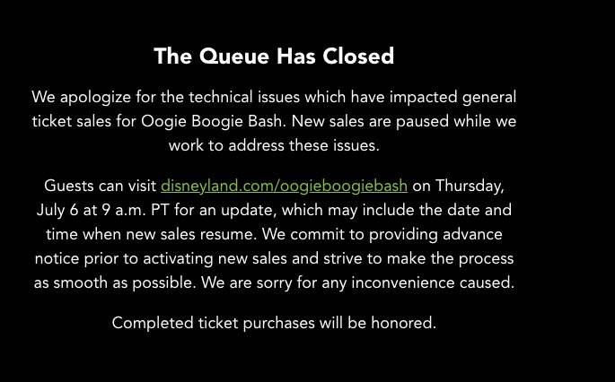 - Guests are asked to visit Disneyland.com/OogieBoogieBash on Thursday, July 6th at 9:00 a.m. PT for an update, which may include the date and time when new sales resume.