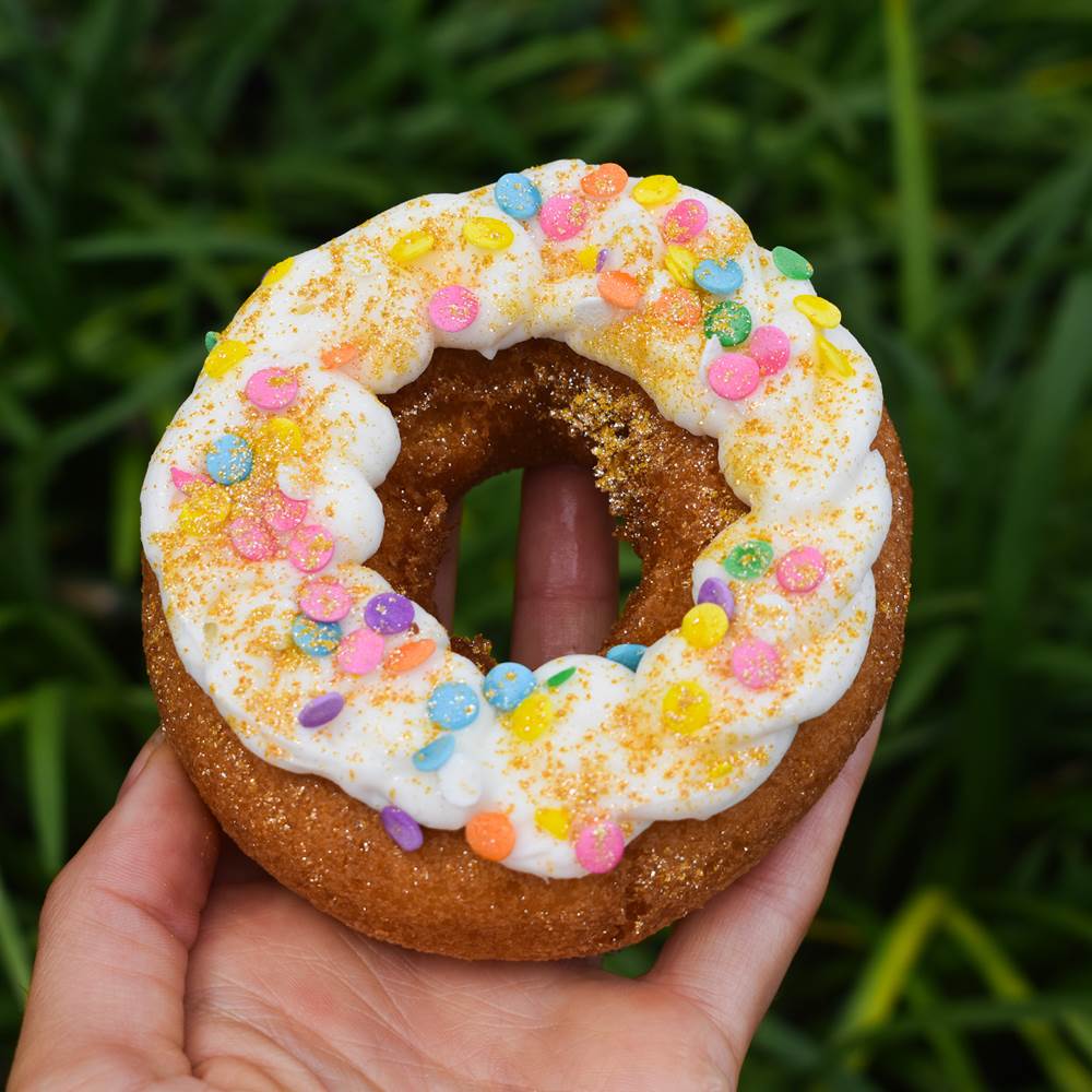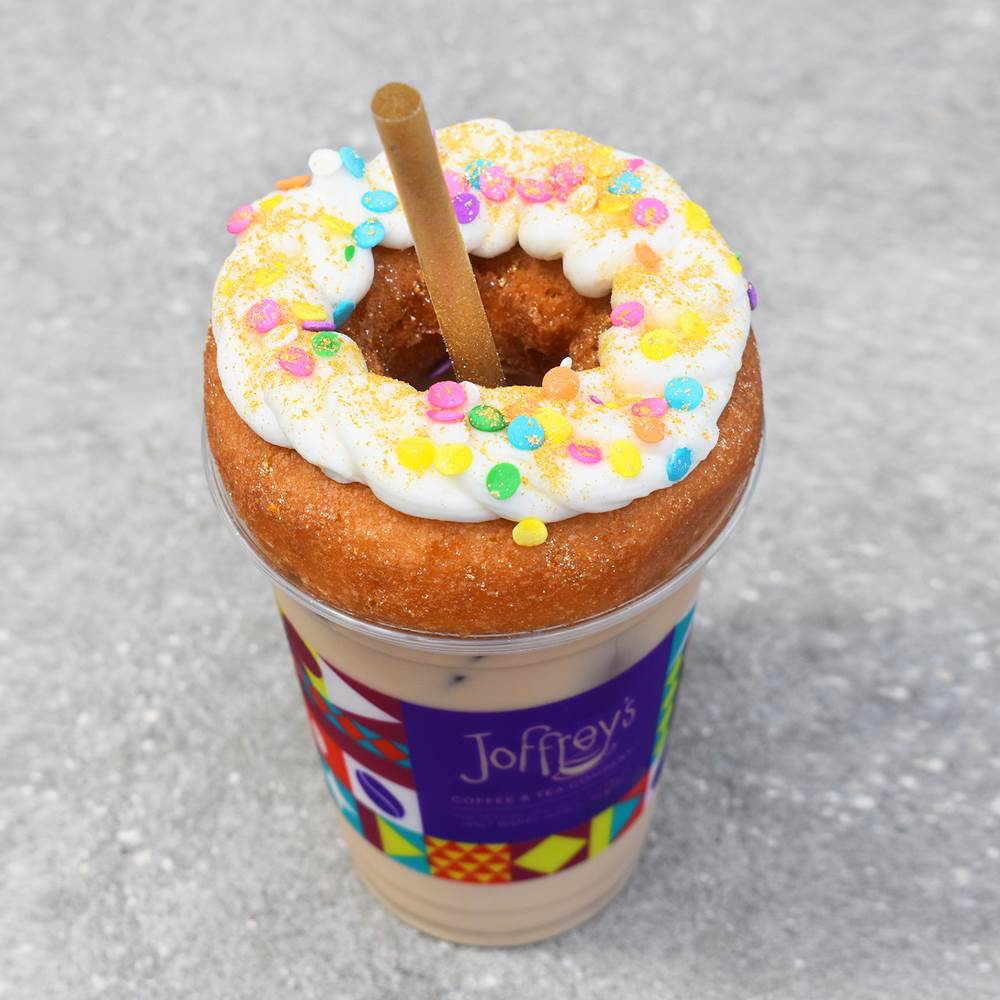 - To celebrate, the coffee shop is offering up an Iced Birthday Bash Latte – a latte with cupcake syrup, topped with a glitter cake donut!