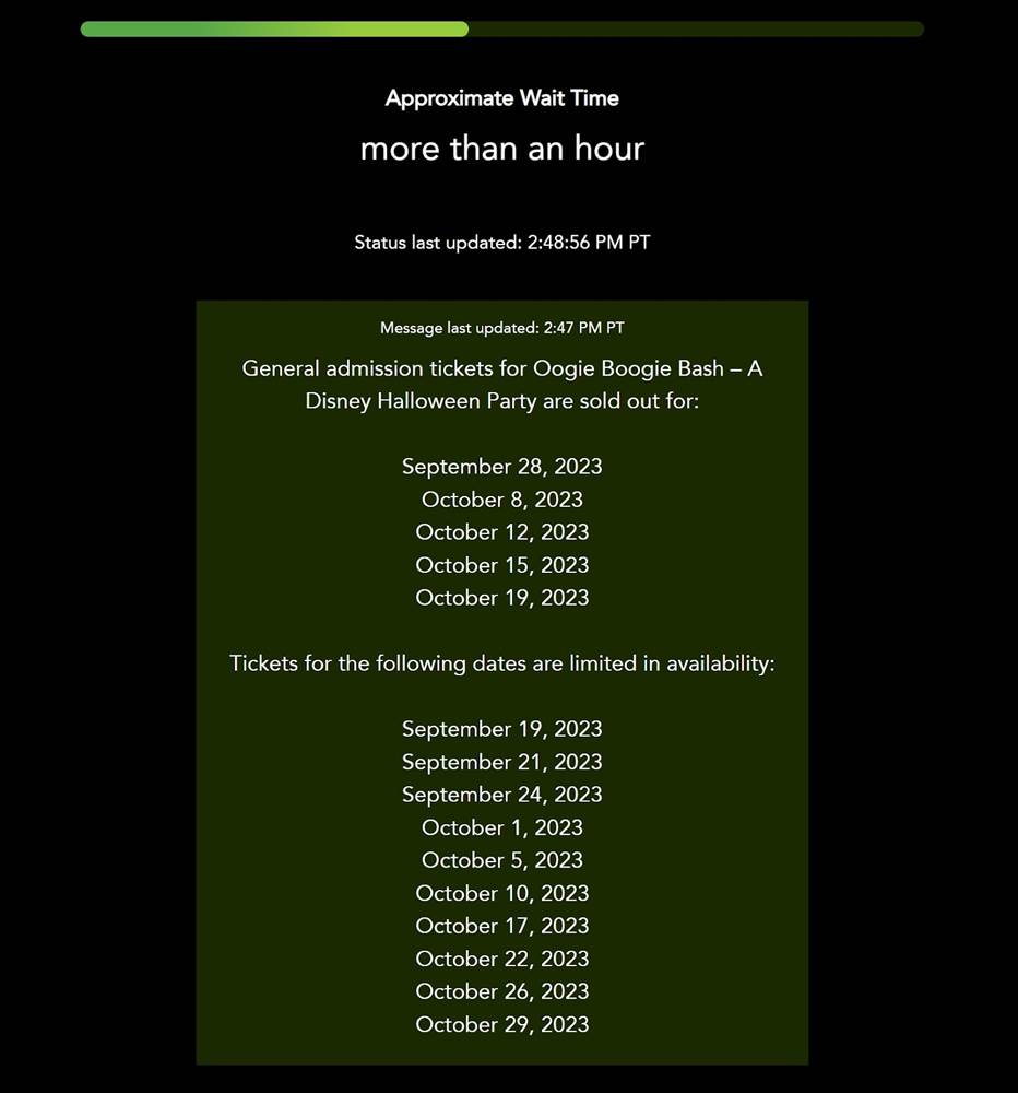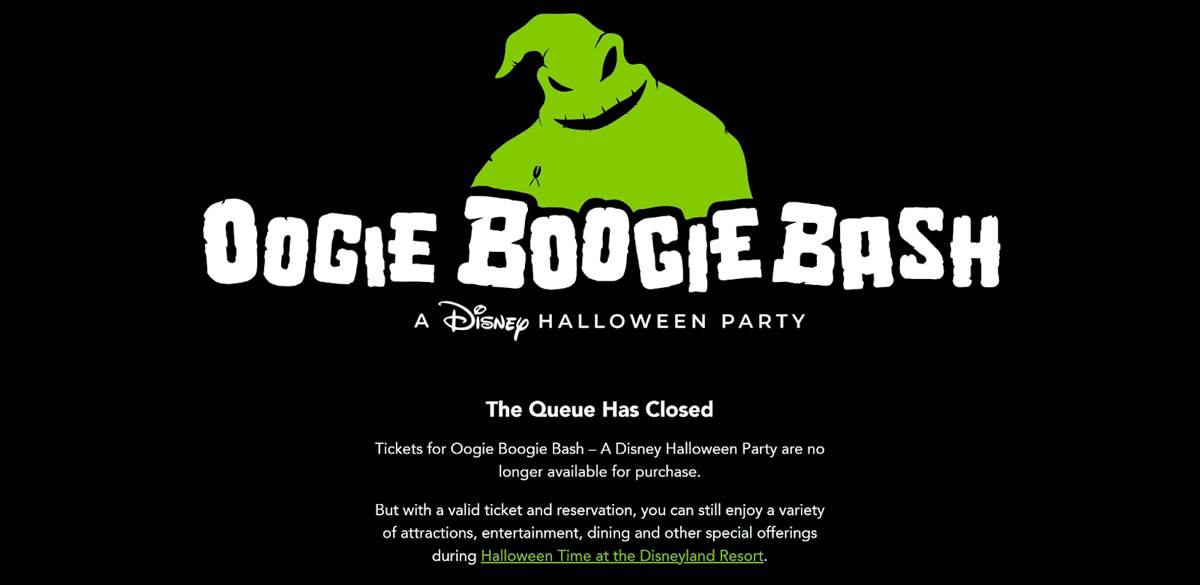 - Disneyland Resort: “You’re in the Queue to Purchase Tickets. When your turn comes, you’ll have 10 minutes to enter the ticket store for Oogie Boogie Bash – A Disney Halloween Party. Please note that ticket availability is limited, and being in the queue does not guarantee the ability to purchase tickets."