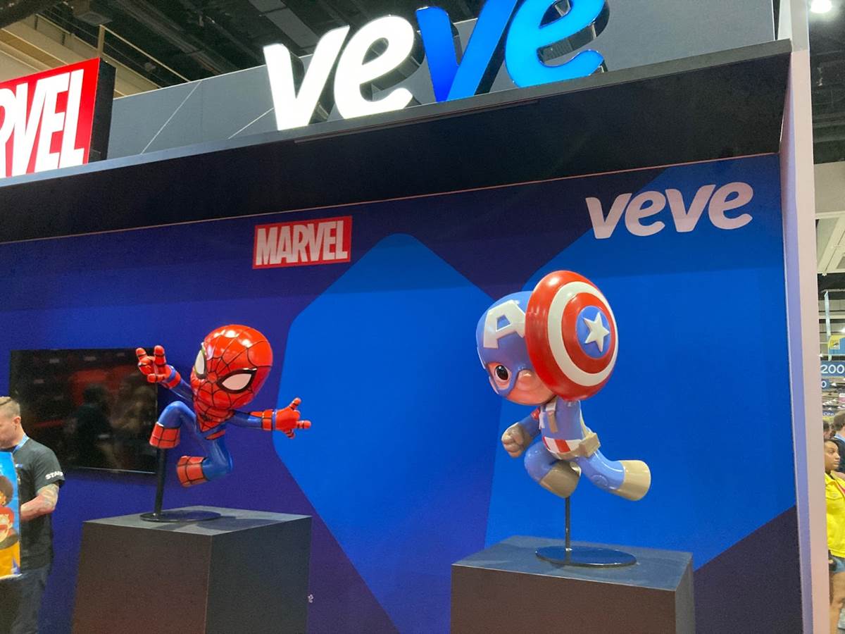 Stylized statues of Spider-Man and Captain America promote the Marvel and Veve digital collectibles collaboration.