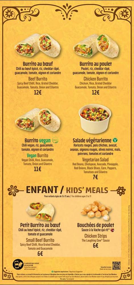 - The menu features a variety of burritos as well as desserts and offerings for younger guests.