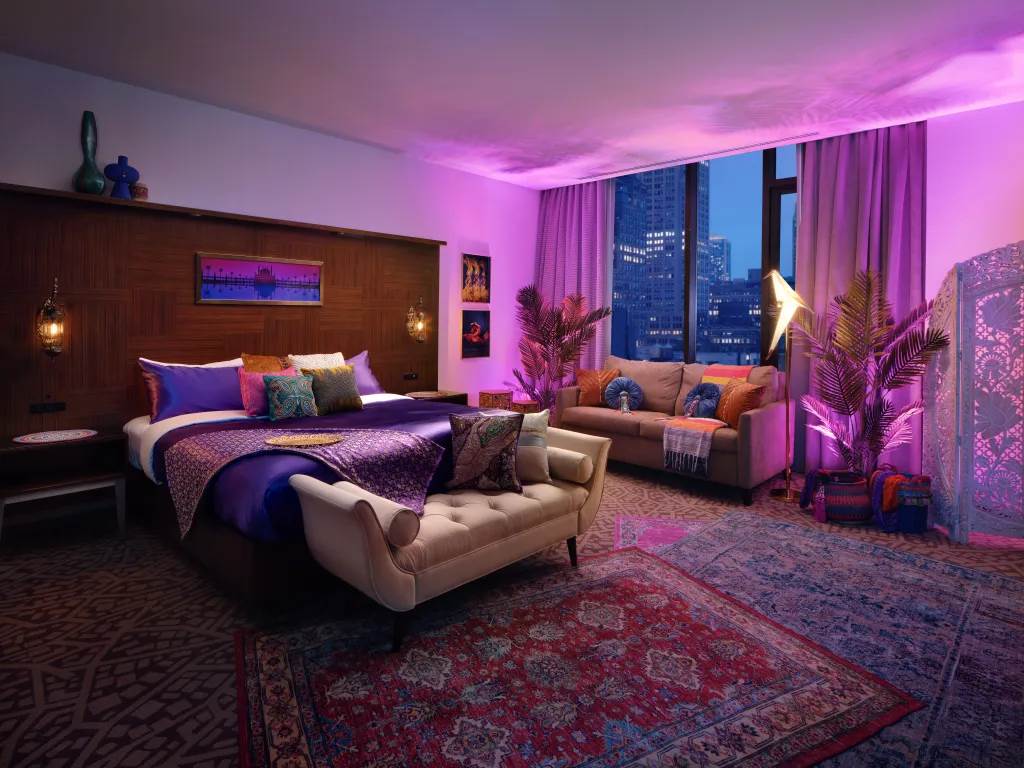 - Designed by Broadway’s top dressing room designer for its most legendary stars, Devin Sparkles Design, the spacious one-king bedroom studio corner suite complete with a pullout couch allows for “High Adventure" in the magical world of Agrabah while taking in wall-to-wall views overlooking Manhattan.