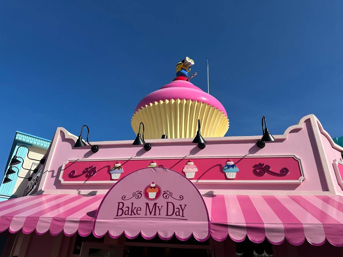 - Topped with a massive pink cupcake that’s visible from anywhere in the land, Bake My Day is a whimsical retail location and bakery featuring a selection of Minion-themed sweet treats, including cupcakes, macarons, s’mores and more, along with exclusive Minion-inspired merchandise like apparel, plush, drinkware, accessories, keychains and more.