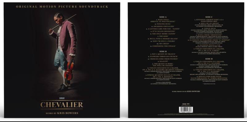 Hollywood Records is has announced the 12" 2-LP vinyl album release of Chevalier (Original Motion Picture Soundtrack) with an original score by Kris Bowers, including two new tracks, "VIOLIN CONCERTO IN C MAJOR, OP. 5, NO. 1: I. ALLEGRO" and "VIOLIN CONCERTO IN A MAJOR, OP. 5, NO. 2: II. LARGO" available exclusively on the vinyl.