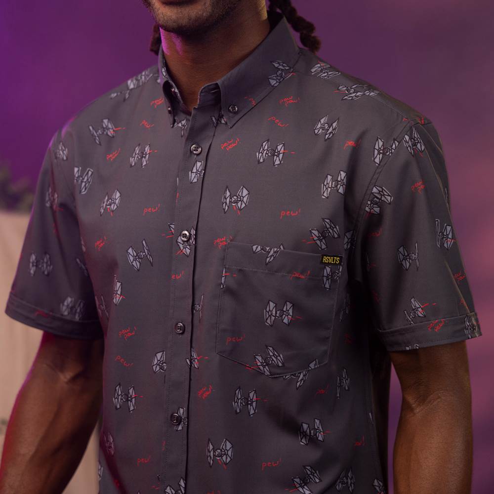 We all know Stormtroopers have a bit of trouble staying on target, but fortunately RSVLTS doesn’t have that issue. This shirt is a direct hit! Tiny TIE Fighters zoom across a dark grey backdrop blasting out lasers along the way and perfectly placed “Pew, Pews" add to the fun. We can hear this shirt!