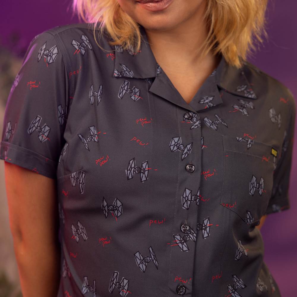 - Fans looking for a small repeating pattern will love Pew Pew, a dark grey top dotted with “hand-drawn" TIE Fighters spitting lasers into space. Naturally the shirt is accompanied with dozens of “Pew Pew" quotes.