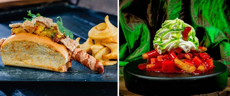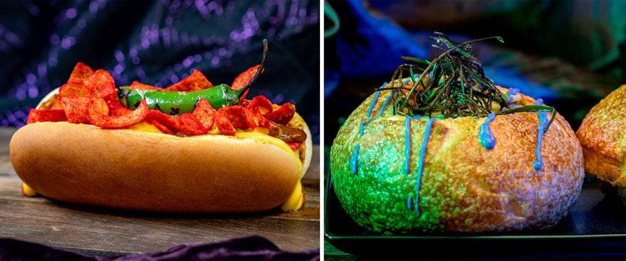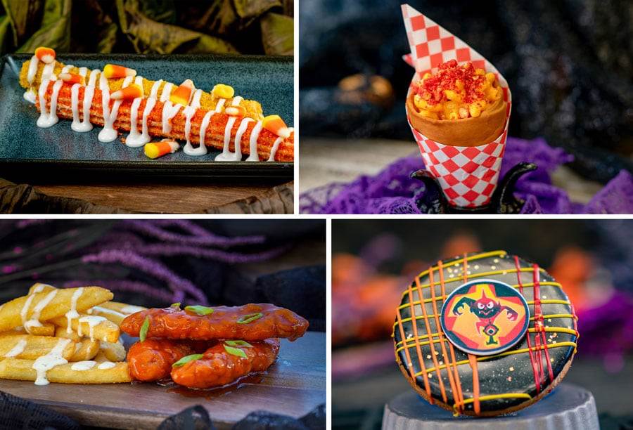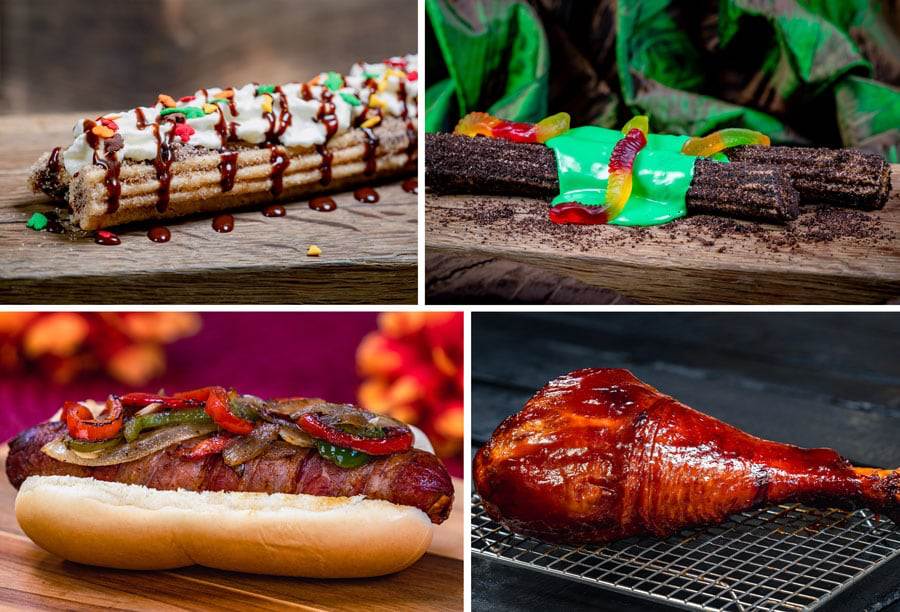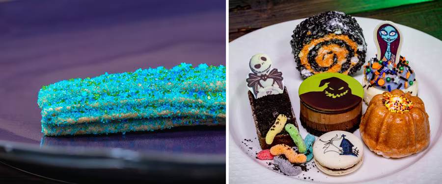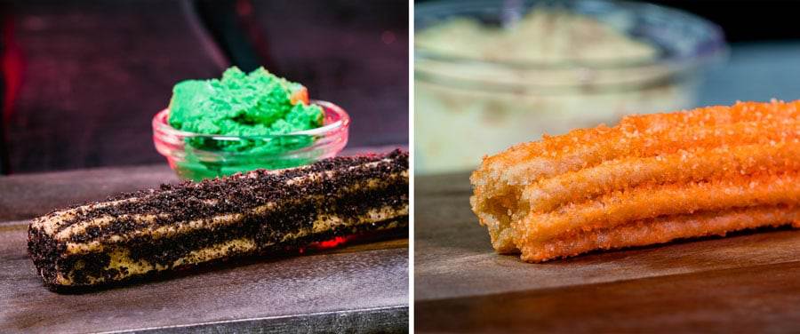 - Oogie Boogie Churro: Chocolate cookie-covered churro with green icing, gummy worms, and candies (New)